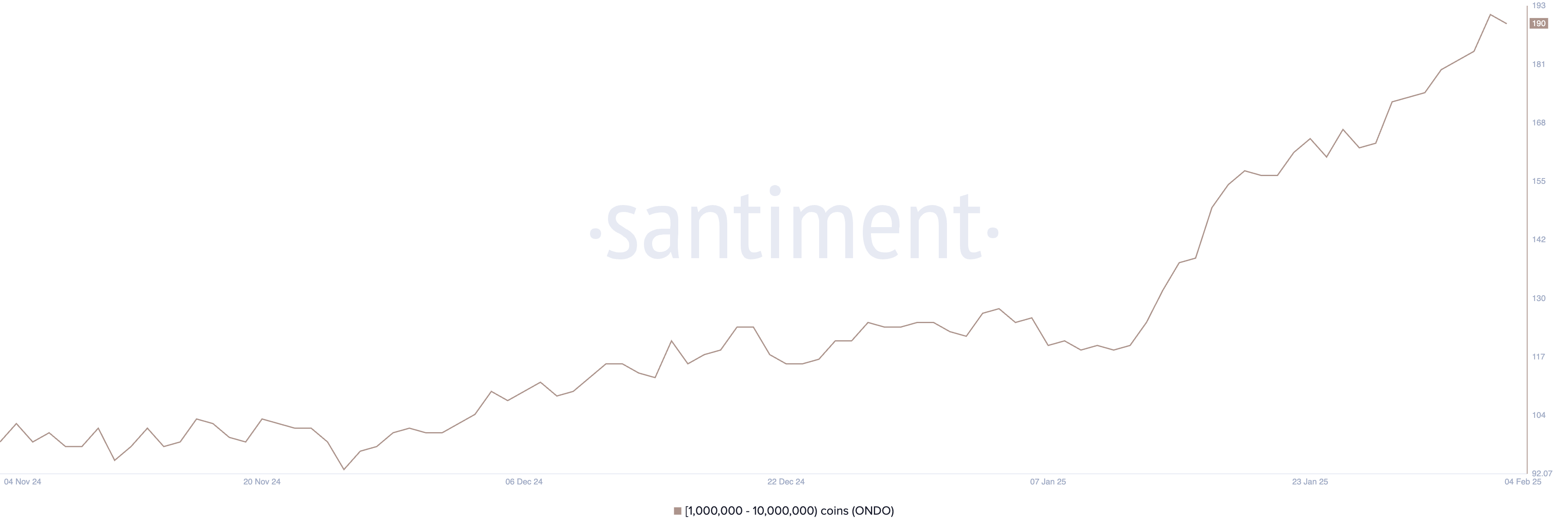 Кількість китів, які володіють від 1 000 000 до 10 000 000 ONDO, трохи знизилася з 193 до 190 за останній день. Однак, незважаючи на це незначне зниження, загальна кількість китів ONDO стабільно зростає з 12 січня, коли їх було лише 120.