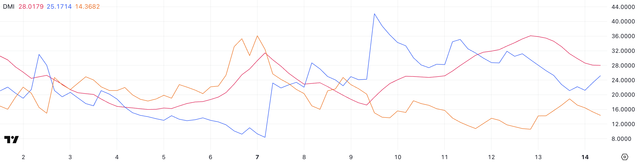 Цей індикатор напрямку руху (DMI) для ONDO засвідчує зниження значення ADX до 28 із 36 за два дні, що сигналізує про послаблення сили нещодавнього тренду. Хоча значення ADX вище 25 усе ще вказує на наявність тренду, його зниження відображає можливу консолідацію.