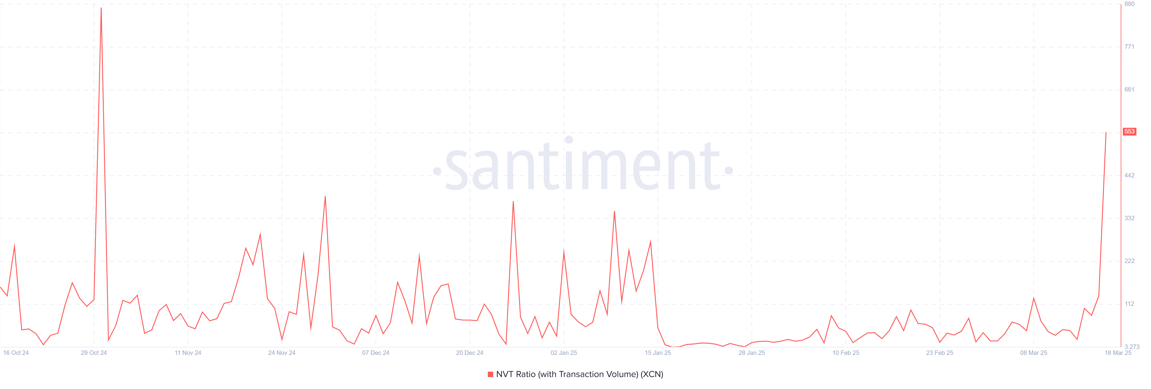 Індекс NVT (співвідношення вартості мережі до транзакцій) для Onyxcoin наразі перебуває на чотиримісячному максимумі, що підкреслює дисбаланс між вартістю мережі та ринковою вартістю активу. Високі показники NVT свідчать про те, що, хоча мережа привертає увагу, фактичні транзакції залишаються слабкими.