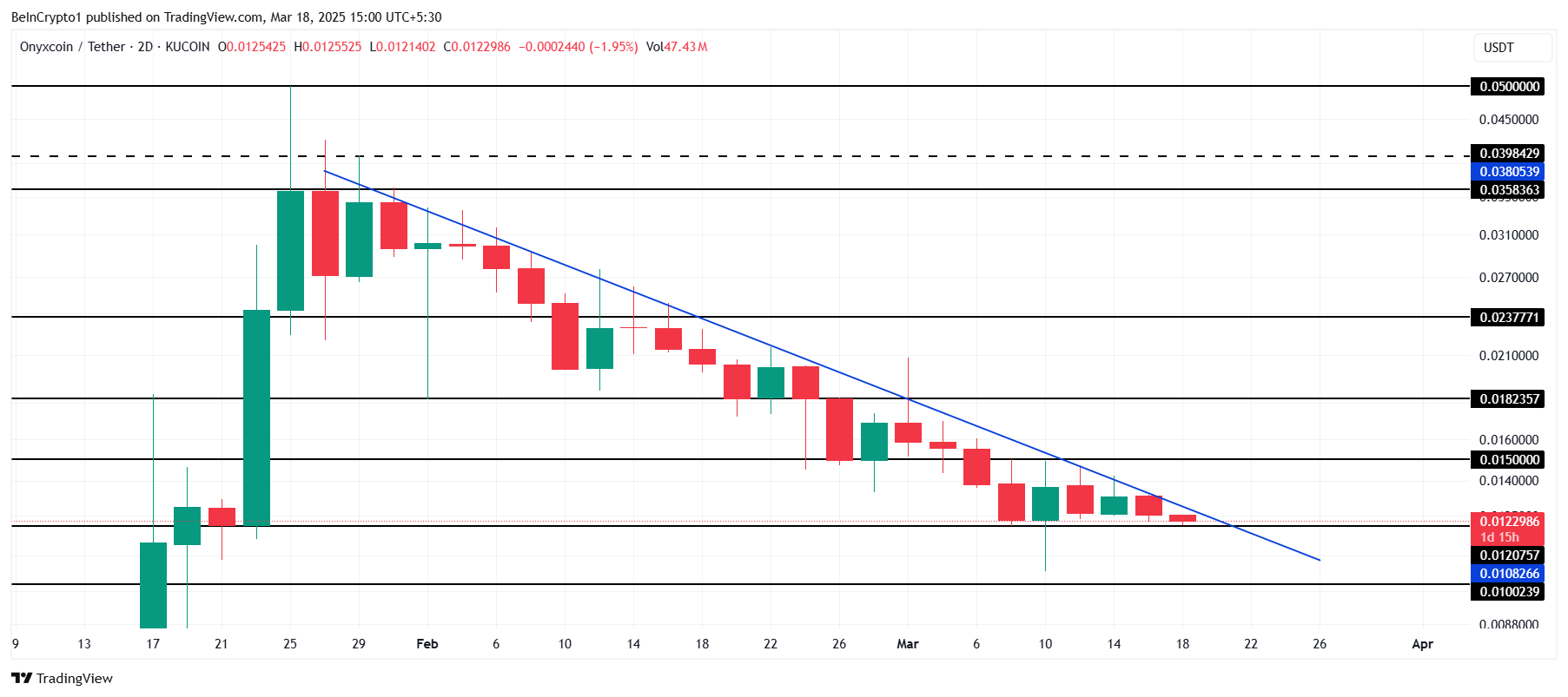 Наразі торгуючись за 0,0122 доларів, Onyxcoin утримується трохи вище критичної підтримки в 0,0120 доларів. Токен застряг у майже двомісячному низхідному тренді, і якщо не відбудеться значних змін у ринкових умовах, цей тренд, ймовірно, триватиме.