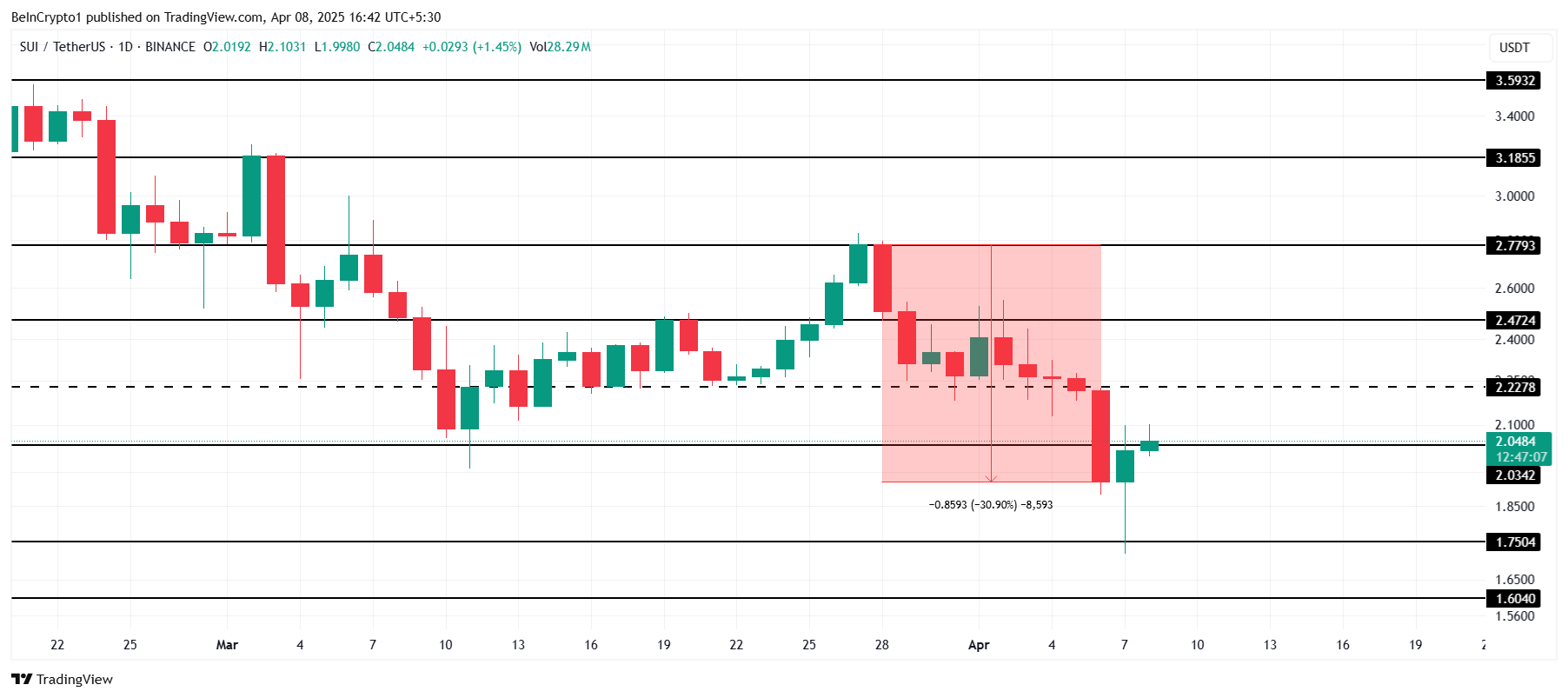 Якщо ведмежий настрій продовжиться, SUI може зіткнутися з подальшим падінням, причому 1,75 доларів може стати наступним рівнем підтримки. Якщо поточна тенденція збережеться, нездатність SUI утримати свою позицію вище 2,00 доларів може призвести до додаткових втрат.