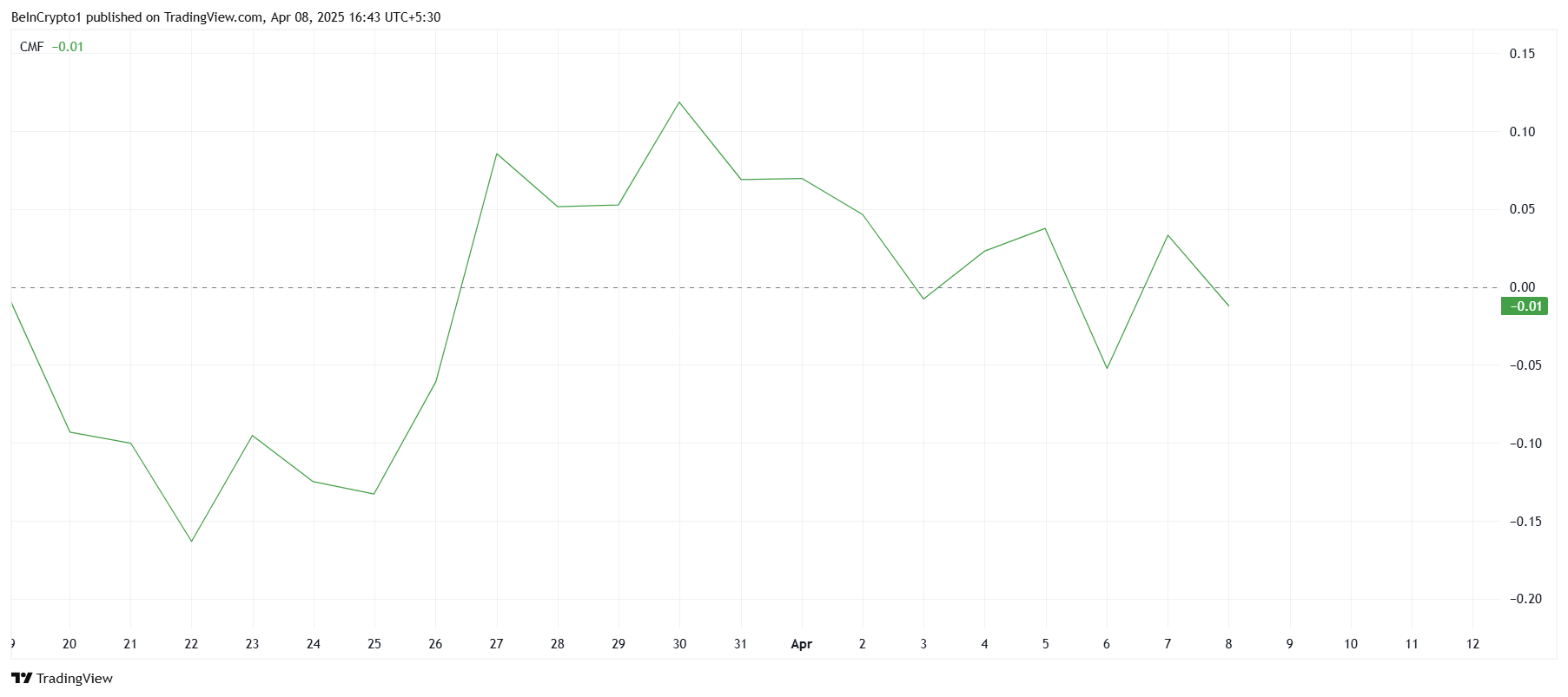 У ширшому контексті індикатор Chaikin Money Flow (CMF), який відстежує припливи та відтоки капіталу, сигналізує про зростаючий скептицизм щодо траєкторії ціни SUI. З початку місяця CMF перемістився нижче нульової лінії, що відображає більше відтоків, ніж припливів. Це свідчить про те, що інвестори вагаються, а відсутність тиску покупців може завадити будь-якому негайному відновленню ціни.