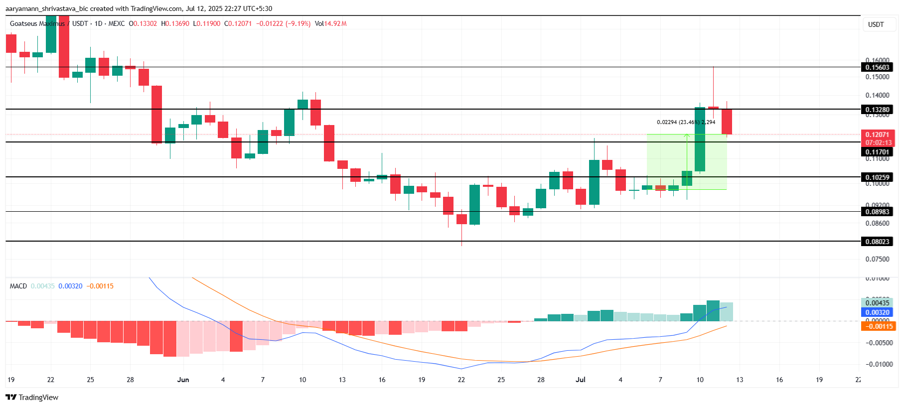 Наразі торгуючись на рівні 0,120 доларів, GOAT утримується вище критичного рівня підтримки в 0,117 доларів. Індикатор MACD вказує на посилення бичачого імпульсу, що потенційно може підняти ціну вгору.