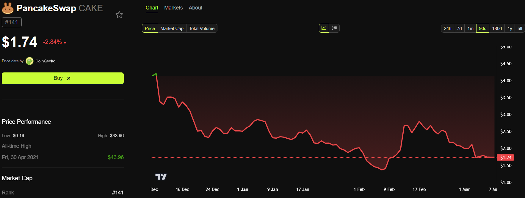 Згідно з даними BeInCrypto, на момент написання PancakeSwap (CAKE) торгується приблизно за 1,74 доларів, що на 60% нижче від недавнього максимуму у 4,5 доларів у грудні минулого року.