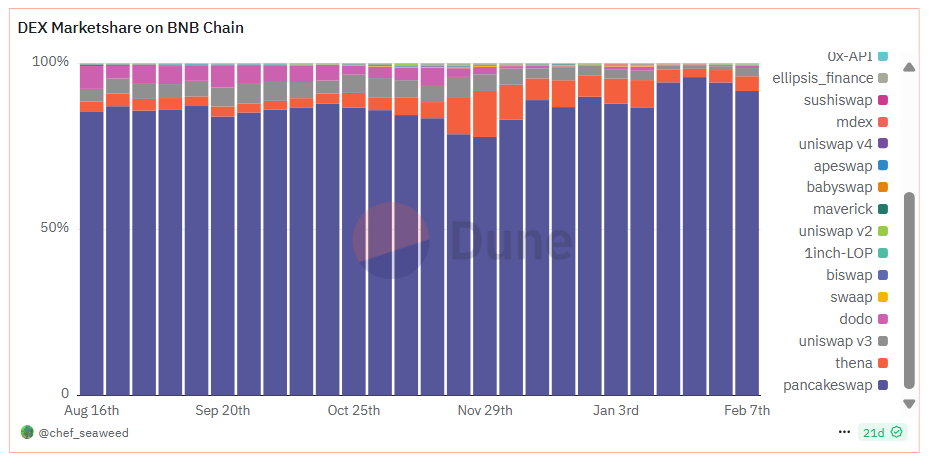Крім того, дані Dune показують, що PancakeSwap утримує понад 90% частки ринку децентралізованих бірж на BNB Chain. Це підкреслює тісний зв’язок між BNB Chain і PancakeSwap.