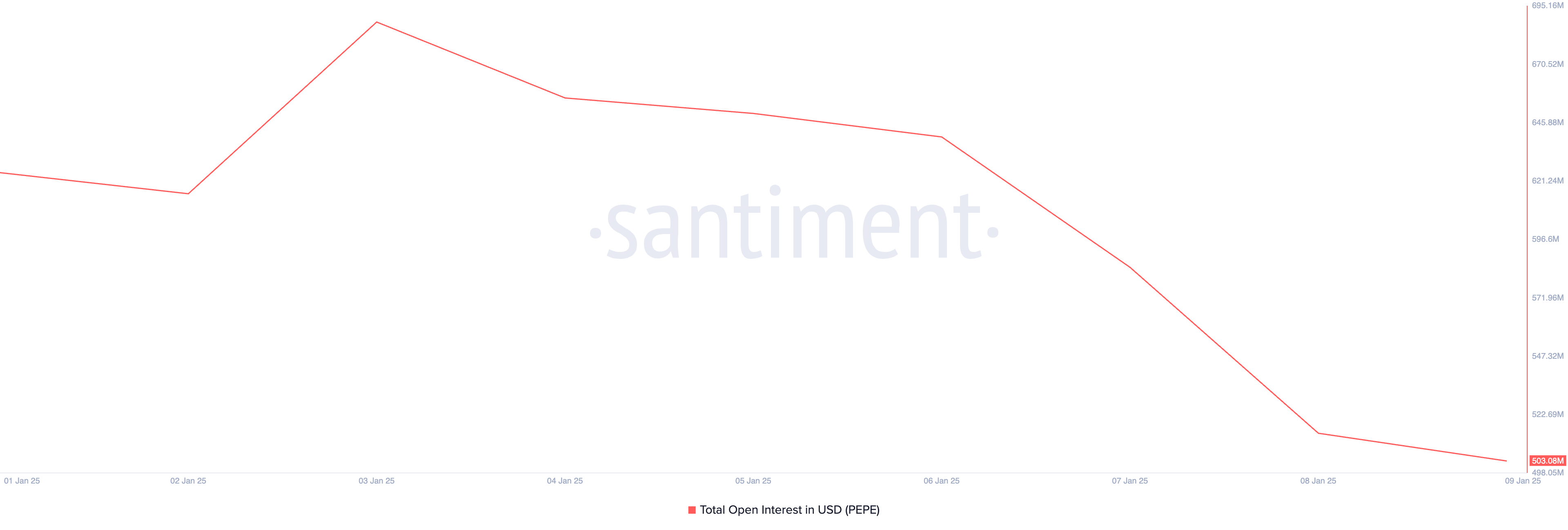 SponsoredКрім того, відкрита зацікавленість PEPE зменшилася в останні дні. Це підкреслює низьку торгову активність навколо мем-монети і сприяє її постійному падінню ціни. На момент написання вона становить 503 мільйони доларів, зменшившись на 19% за останній тиждень.