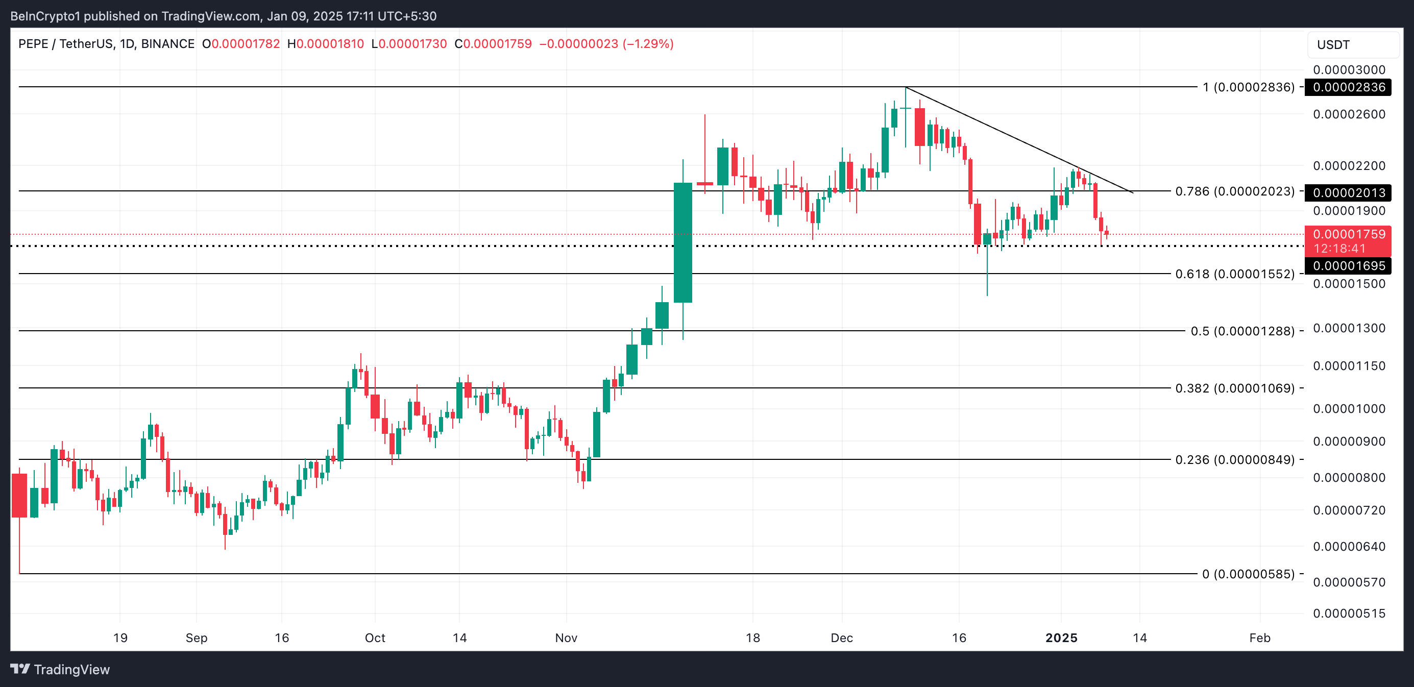 Ціна PEPE впала стабільно за останні кілька днів. Мем-монета торгується за 0.000017 доларів на момент написання, відзначаючи падіння ціни на 14% за останні сім днів.