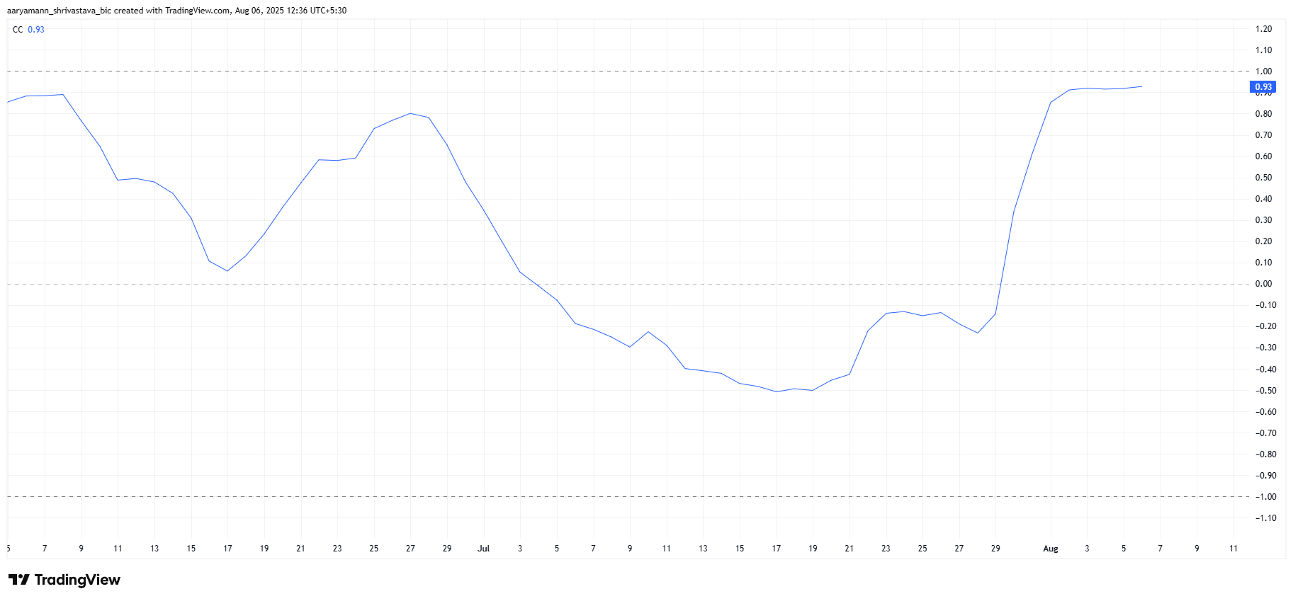 Кореляція між Pi Coin та біткоїном наразі становить 0,93, що вказує на сильний зв’язок між цими двома активами. Коли біткоїн зазнає волатильності та невизначеності, Pi Coin, як правило, слідує за його траєкторією.