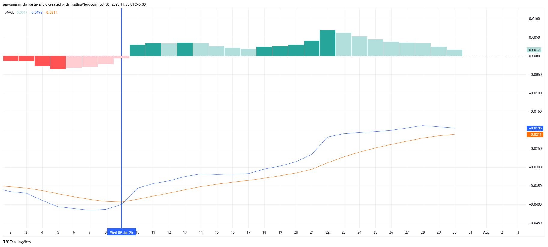Окрім MACD, індикатор імпульсу стиснення також показує ознаки зростаючої волатильності. Поява чорних точок на графіку означає формування стиснення, патерну, що передує великим ціновим рухам.