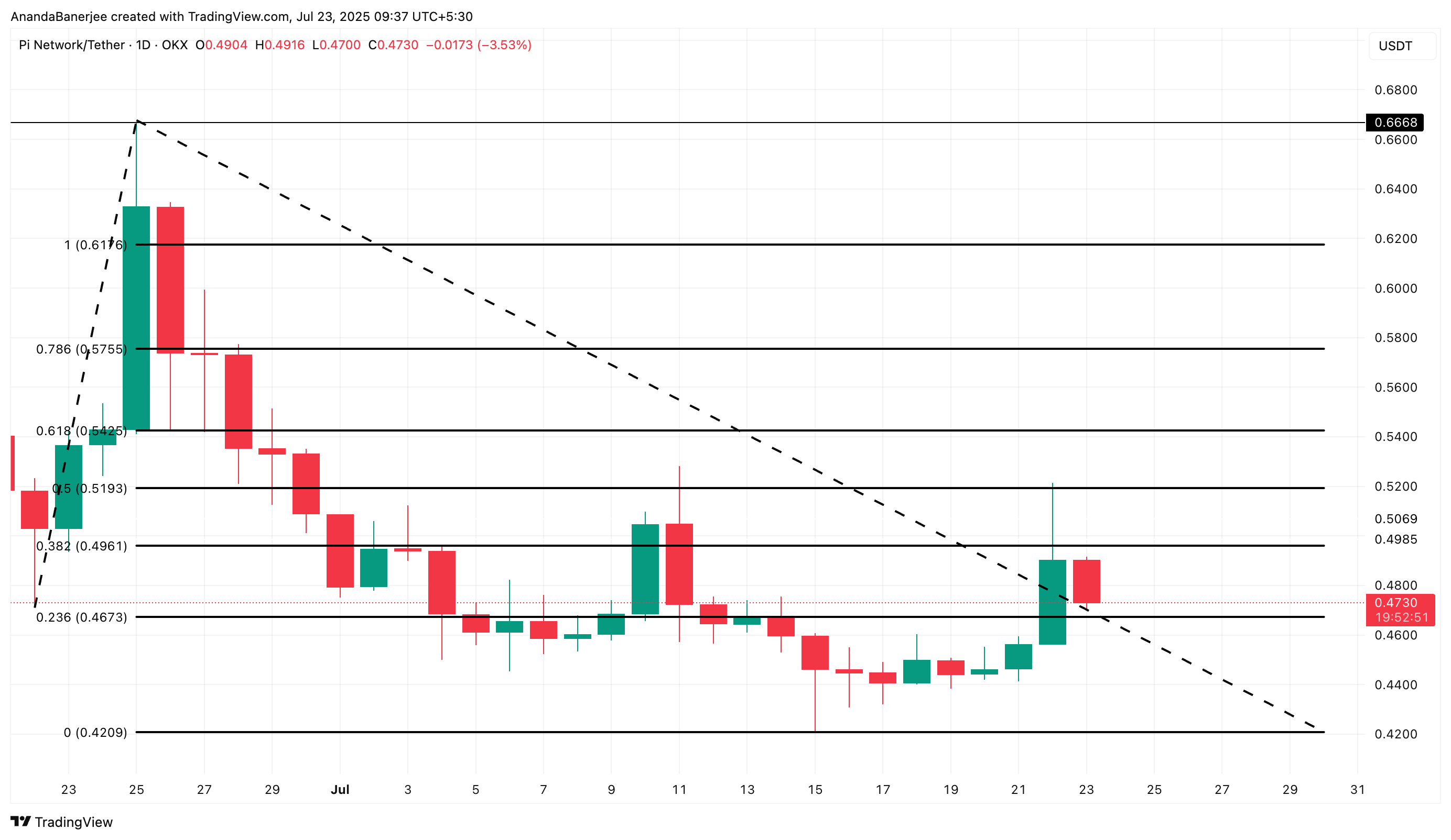 Свічка у вівторок прорвала три смуги Фібоначчі за один день: 0,236 на 0,46 доларів, 0,382 на 0,49 доларів і 0,5 на 0,51 доларів. Ціна PI зараз зупинилася в діапазоні 0,46–0,49 доларів.