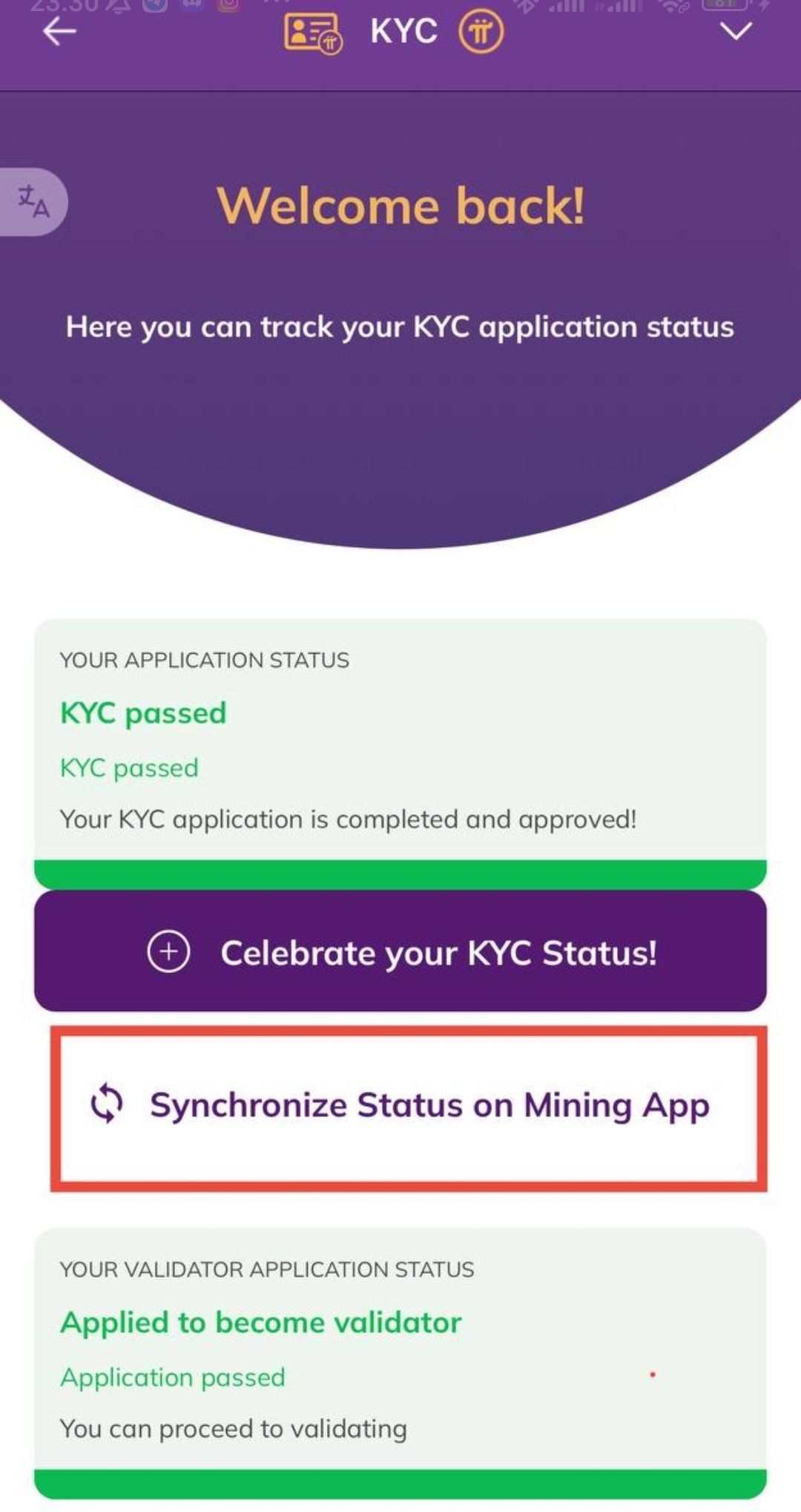 Нова функція KYC активується через кнопку «Синхронізувати статус у додатку для майнінгу». Це вирішує давню проблему синхронізації даних, над якою команда Pi Core працювала для вирішення.