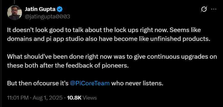 Інші висловили розчарування через повільний запуск обіцяних функцій екосистеми. Інструменти, такі як Pi Domains та App Studio, залишаються або незавершеними, або неактивними, незважаючи на попередні анонси.
