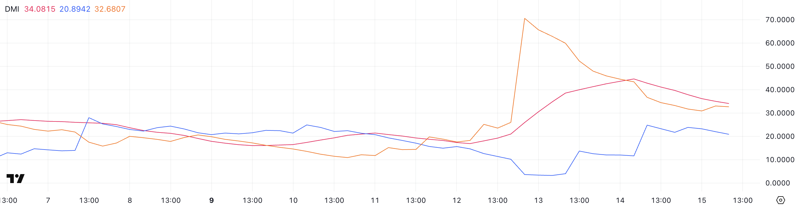 Показники нижче 20 вказують на слабкий або відсутній тренд, тоді як значення вище 25 сигналізують про сильний тренд. З ADX, що все ще перевищує 30, Pi, ймовірно, перебуває у фазі тренду, але імпульс, здається, слабшає.