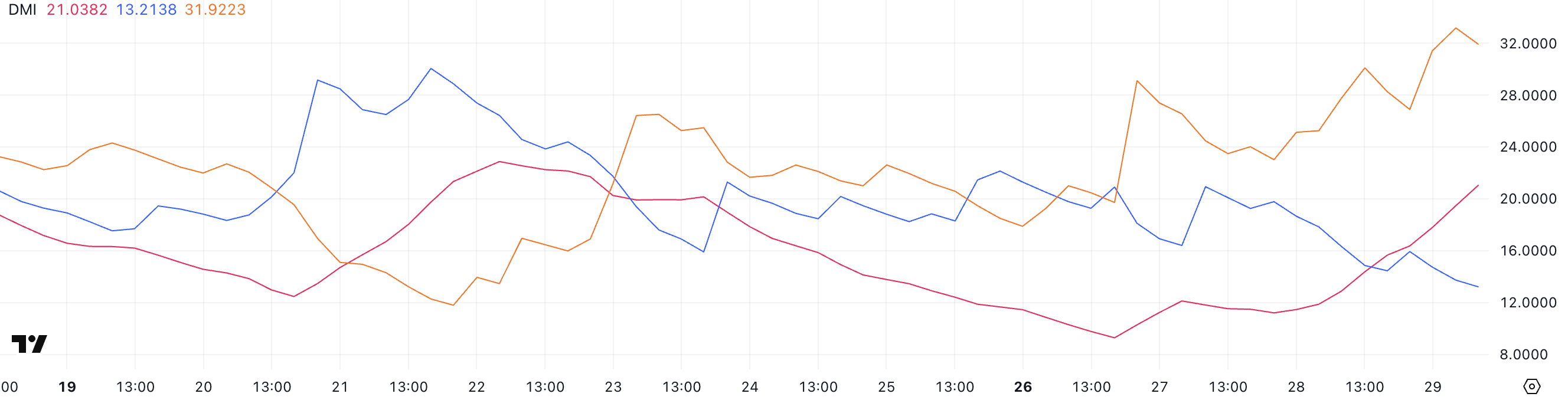 Цей розширюваний розрив, з явним домінуванням -DI, сигналізує про зростаючий тиск на зниження PI. Коли -DI піднімається вище +DI разом із зміцненням ADX, це зазвичай підтверджує ведмежий тренд, що набирає обертів.