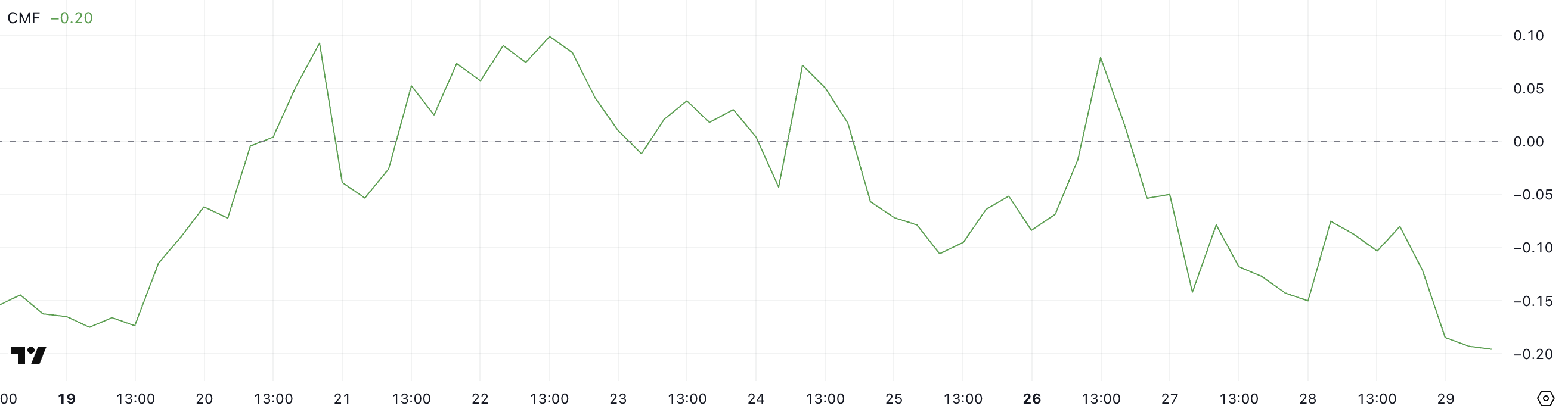 Значення вище 0 зазвичай вказують на тиск покупок та накопичення, тоді як значення нижче 0 свідчать про тиск продажів та розподіл. Читання CMF понад ±0,10 зазвичай вважається значущим, а глибші негативні значення вказують на стійкі відтоки.