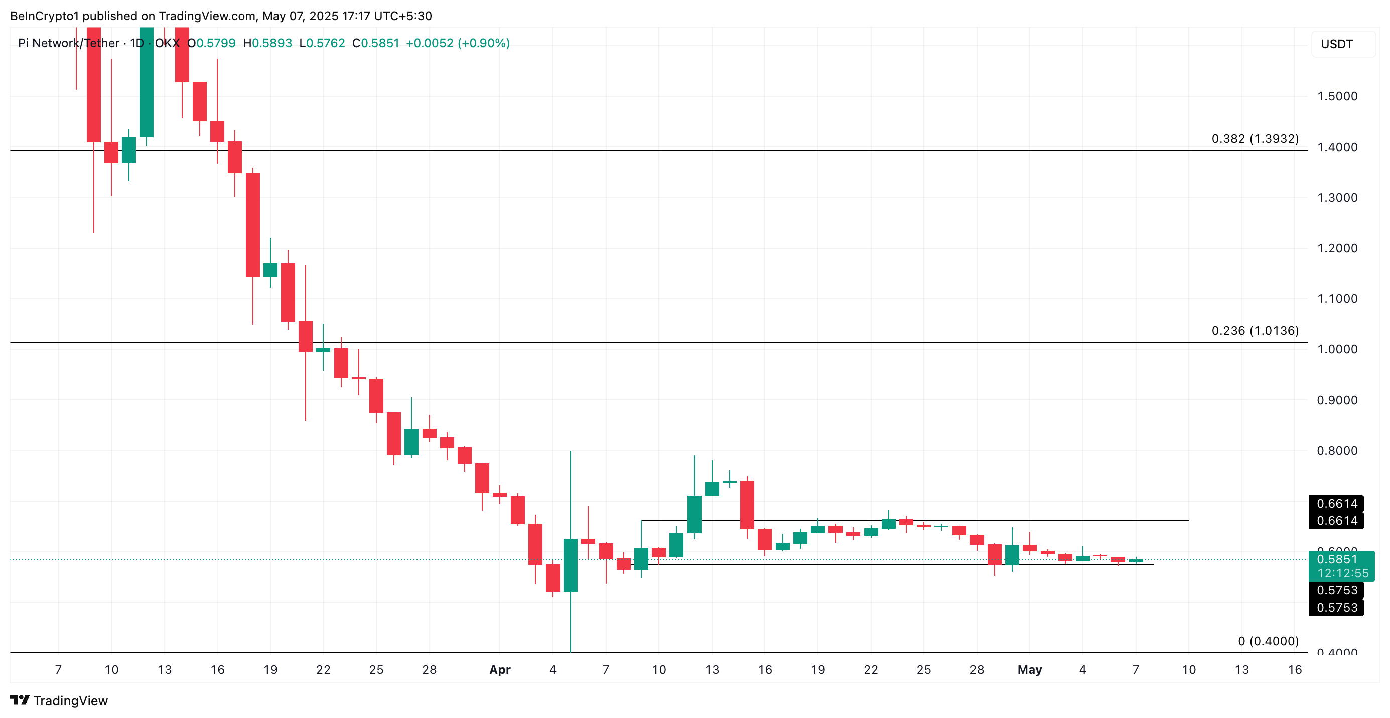 На момент написання PI торгується за 0,58 доларів, знаходячись трохи вище ключового рівня підтримки, сформованого на рівні 0,57 доларів. Ця зона слугувала критичним рівнем для токена протягом його фази консолідації, постійно запобігаючи зниженню.