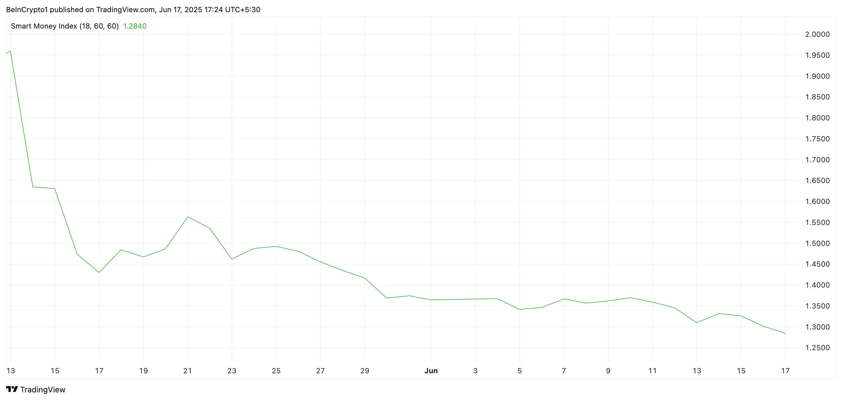 Більше того, постійне зниження індексу Smart Money Index (SMI) PI свідчить про те, що інституційний капітал все більше відходить від активу. На момент написання цей показник становить 1,28, знизившись на 10 % за останні 30 днів.