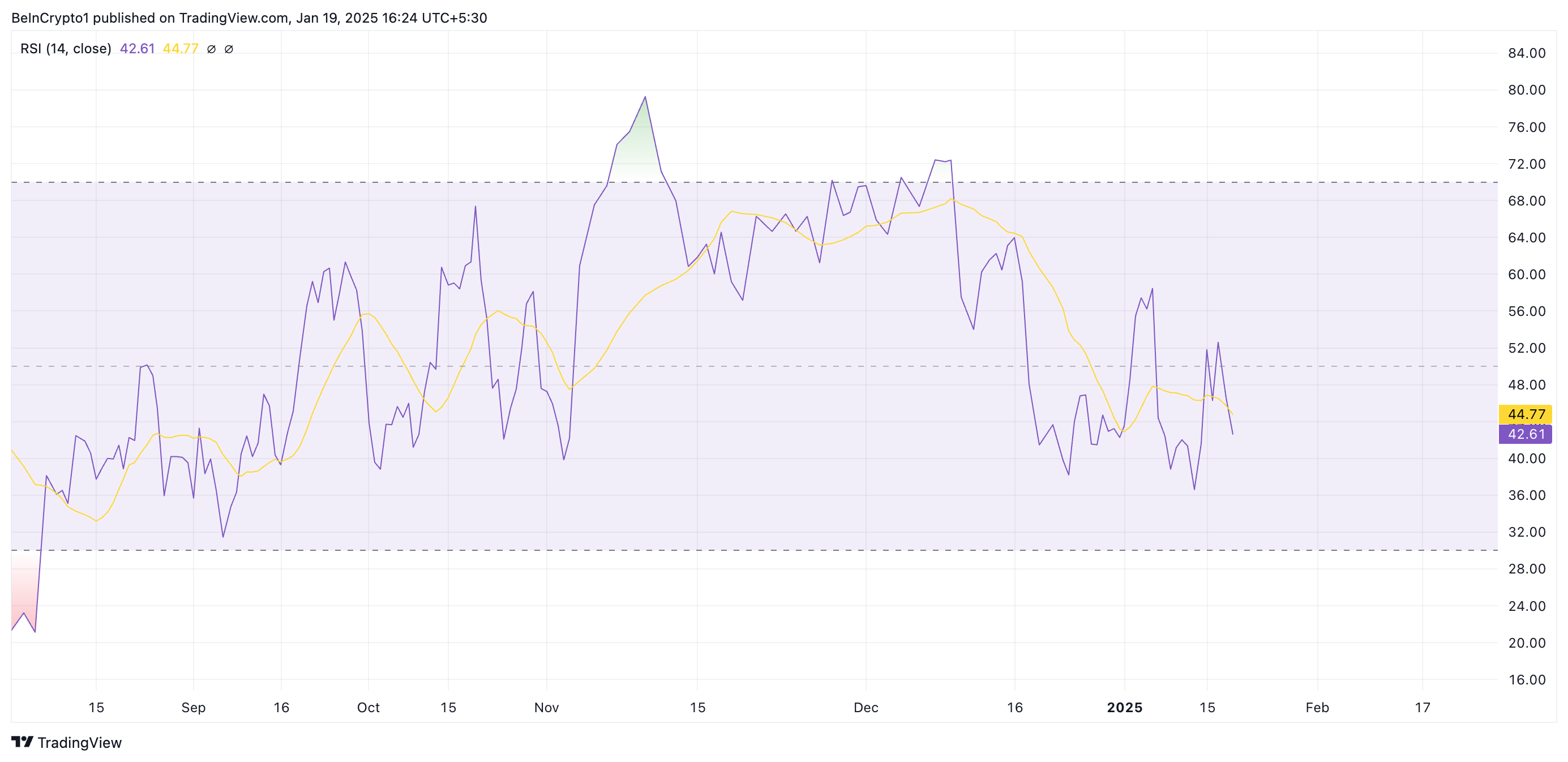 Оцінка індикаторів моментуму ETH на одноденному графіку ETH/USD показує зниження попиту на альткоїн. Наприклад, його індекс відносної сили (RSI) знаходиться в низхідному тренді і нижче нейтральної лінії 50. На момент написання його значення становить 42,61.
