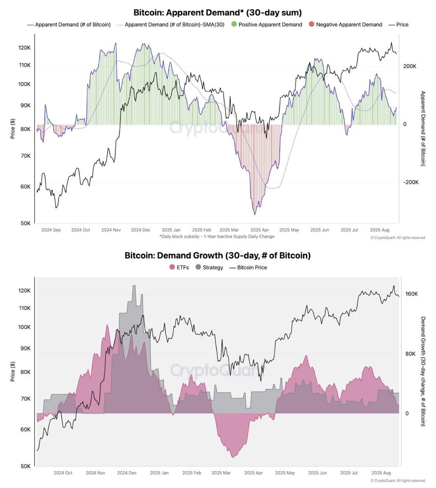 Хуліо Морено, керівник досліджень на ончейн-платформі CryptoQuant, поділився цією думкою у дописі на X у середу. Він зазначив: «Уповільнення загального зростання попиту на біткоїн, включаючи покупки з боку ETF-ів та стратегій, є причиною поточної паузи/корекції ціни».