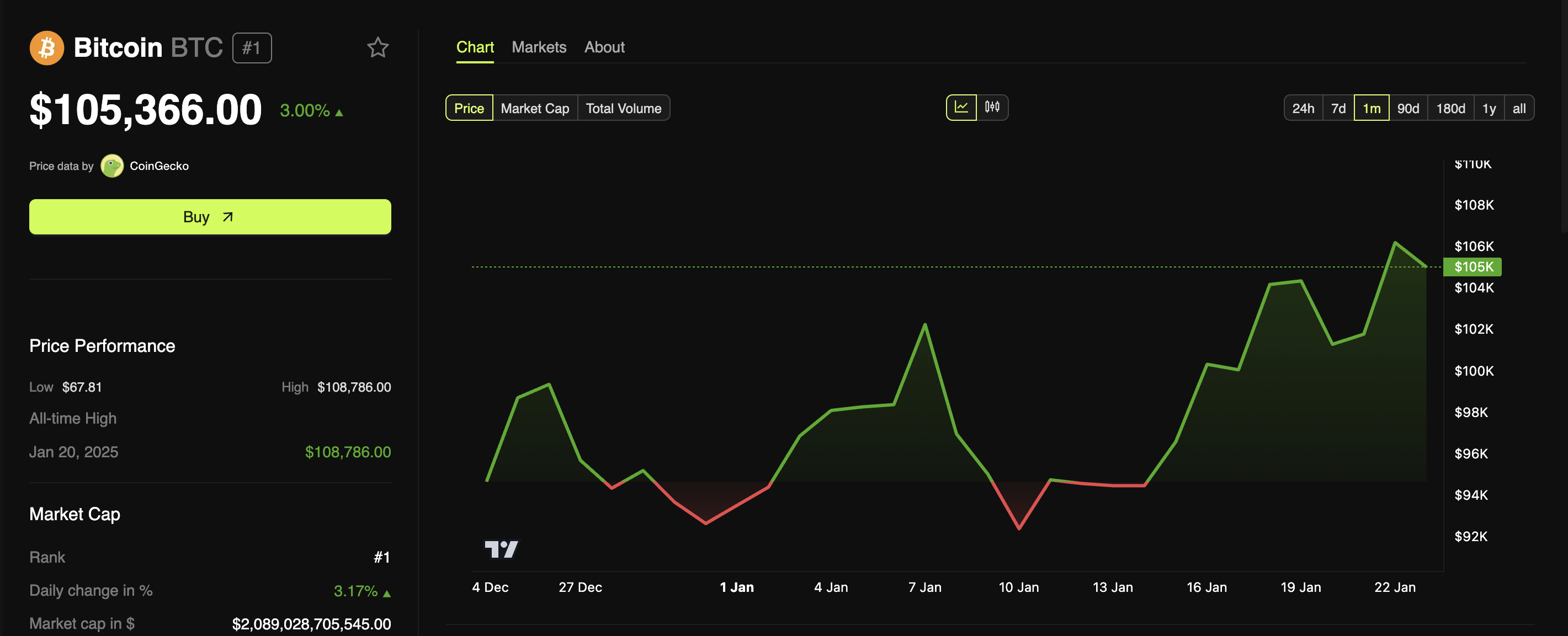 Поки ці події розгортаються, біткоїн продовжує зростати. На момент написання статті провідна криптовалюта торгувалася за 105 366 доларів. Це означало зростання на 3% за останні 24 години.