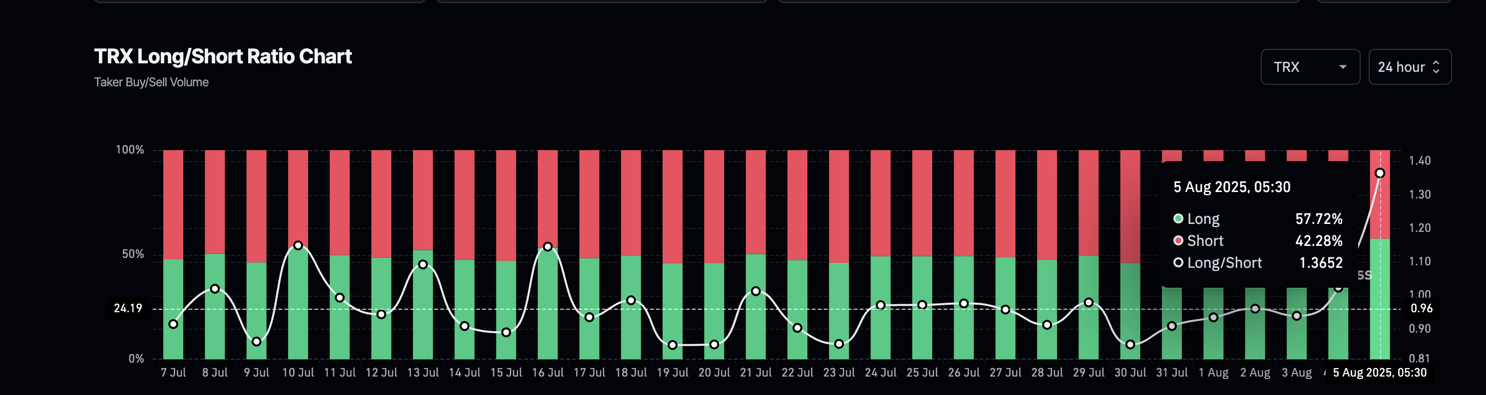 Проте співвідношення довгих і коротких позицій TRON свідчить про те, що роздрібні трейдери налаштовуються на зростання. Станом на 5 серпня співвідношення довгих і коротких позицій зросло до 1,36, причому майже 58 % всіх відкритих угод віддають перевагу довгим позиціям. Це вказує на зростаючий спекулятивний попит; якщо імпульс наздожене, це може посилити будь-який бичачий прорив. Довгий ухил може стати тригером для підвищення MFI.