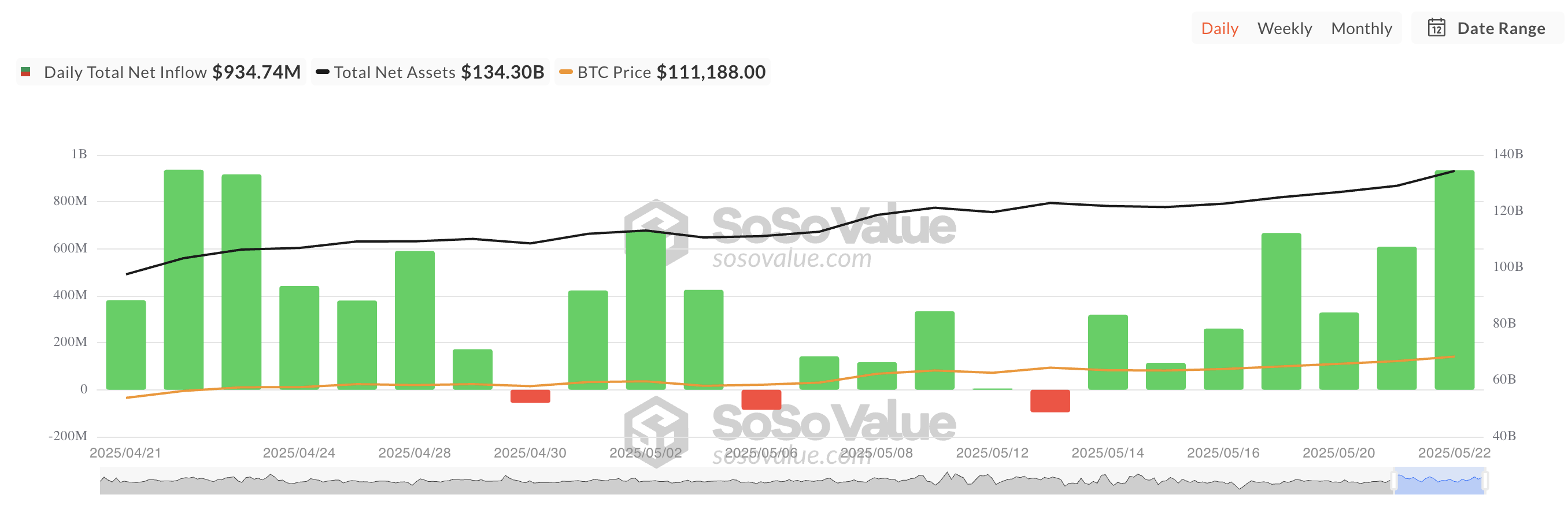 Вчора притоки у фонди, забезпечені біткоїном, склали 934,74 млн доларів, що є найбільшим одноденним притоком з 22 квітня. За даними SosoValue, це також стало сьомим поспіль днем позитивних притоків, що свідчить про сильне відновлення інституційної довіри цього тижня.