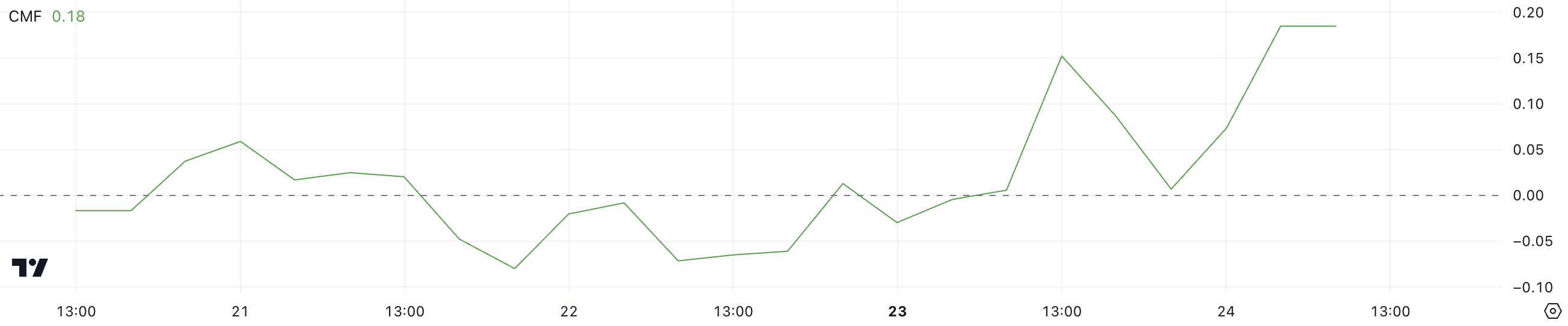 CMF – це індикатор, зважений на обсяг, який вимірює накопичення або розподіл активу за певний період, варіюючись від -1 до +1. Позитивні значення вказують на накопичення та тиск покупців, тоді як негативні значення свідчать про розподіл та тиск продавців.