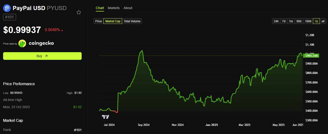 За даними BeInCrypto, ринкова капіталізація PYUSD досягла 984 млн доларів у червні. Це зростання з 490 млн доларів на початку року. За такої швидкості PYUSD може незабаром перевищити свій попередній пік у 1 млрд доларів з серпня 2024 року.