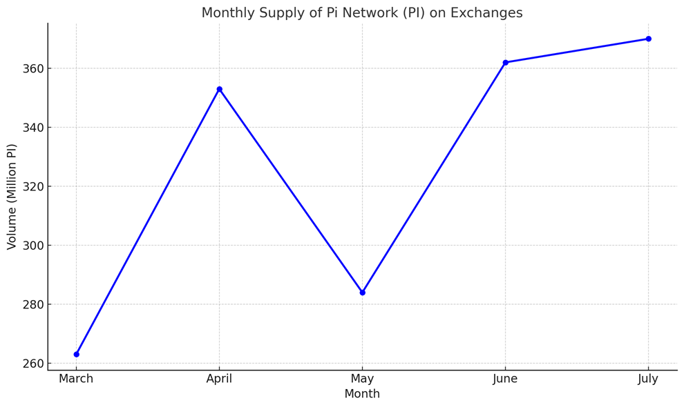 Відповідно до спостережень BeInCrypto, кількість токенів PI на централізованих біржах постійно зростала протягом останніх п’яти місяців. Цей показник зріс з 263 мільйонів у березні до понад 370 мільйонів зараз — збільшення більш ніж на 40 %.