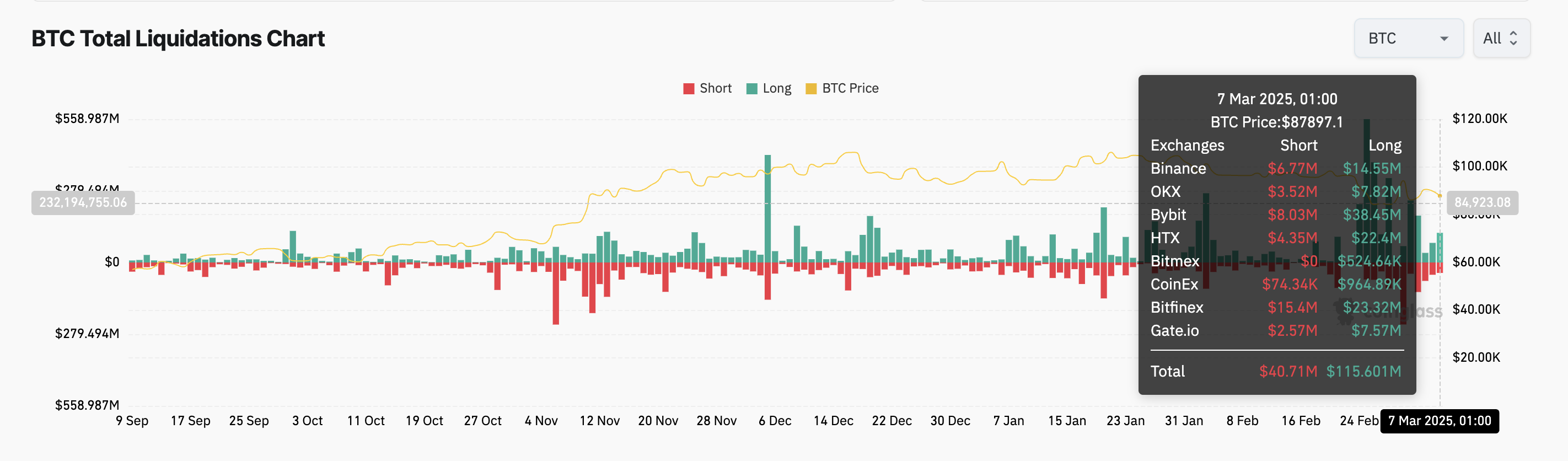 Дані ончейн свідчать, що більшість цих втрат припадає на довгі позиції, що вказує на те, що трейдери, які очікували зростання ціни, були заскочені зненацька раптовим падінням. За інформацією Coinglass, ліквідації довгих позицій біткоїна наразі становлять 115,60 мільйона доларів — це найвищий показник за три дні.