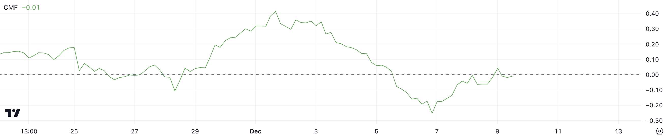 CMF XRP зараз на рівні -0,01, після короткочасного позитивного значення 0,04 кілька годин тому. Індикатор досяг негативного піку -0,25 6 грудня, після того як залишався позитивним з 29 листопада по 5 грудня.