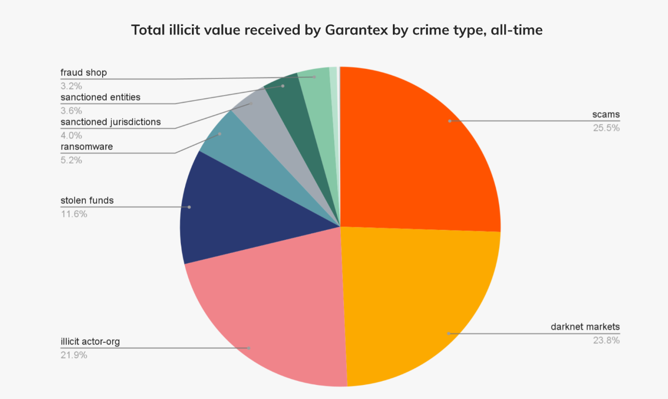 Раніше Chainalysis виявила, що Garantex отримувала кошти від усіх видів злочинної діяльності. Більшість її коштів включали вкрадену криптовалюту, пов’язану з великими зломами, програмами-вимагачами та ринками даркнету.