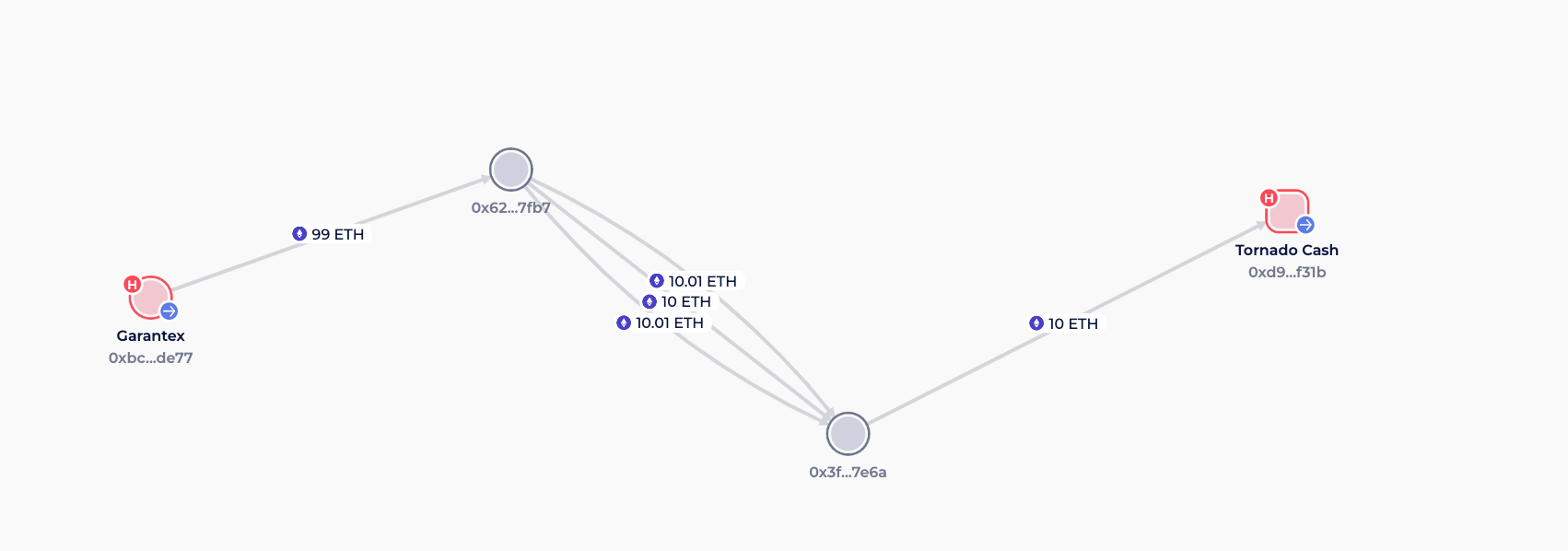 Зокрема, гарячий гаманець Garantex ініціював переказ 99 ETH, вартістю приблизно 261 000 доларів, на проміжну адресу.