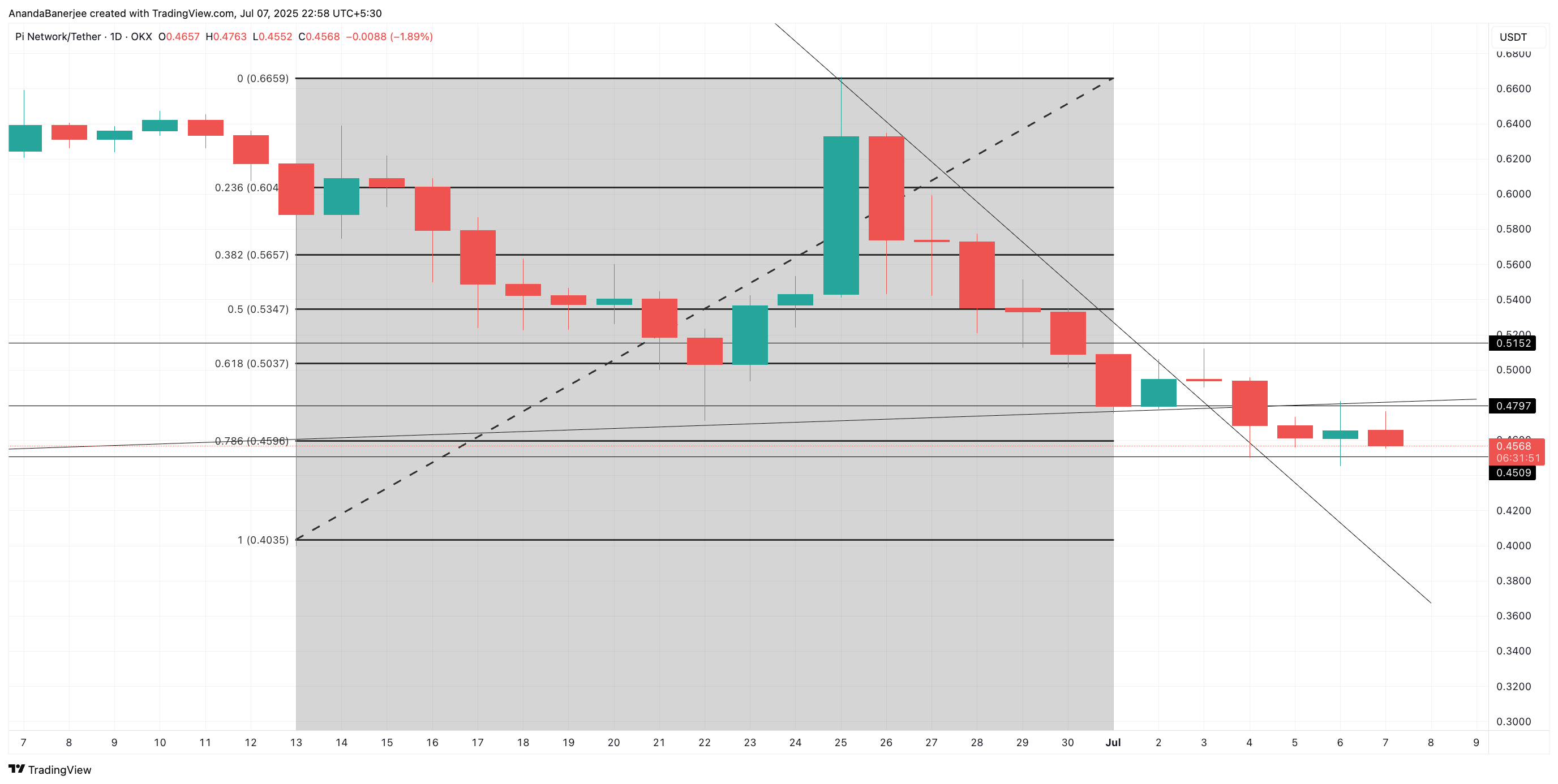 Однак, якщо ціна PI прорветься нижче зони підтримки на рівні 0,4035 доларів, вся бичача теза руйнується, ймовірно, затягуючи PI у глибшу корекцію.