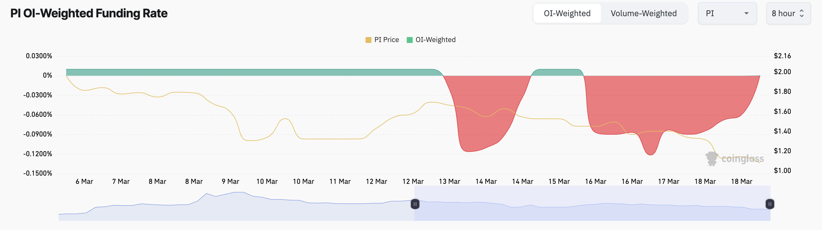 Ставки фінансування на безстрокових контрактах PI залишаються стійко негативними. Це означає, що трейдери, які утримують довгі позиції, отримують виплати від тих, хто шортить PI, що є ознакою високої ведмежої впевненості.