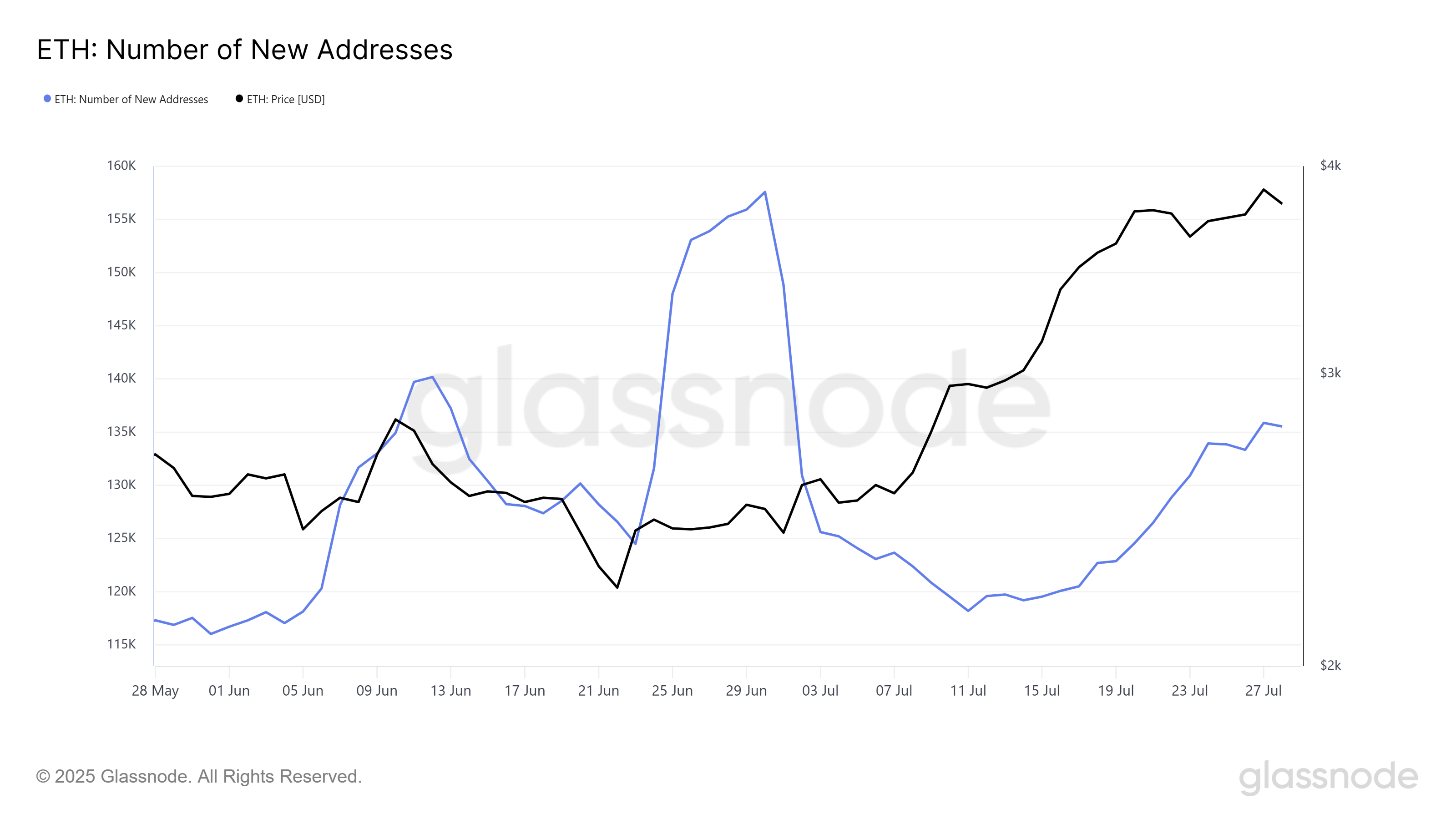Макроімпульс Ethereum демонструє змішану тенденцію, з акцентом на активність нових адрес. На початку цього місяця кількість нових адрес різко зросла, але потім різко знизилася. Однак останні дані показують зростання на 13 % нових адрес за останні 10 днів, з 119 184 до 135 532.
