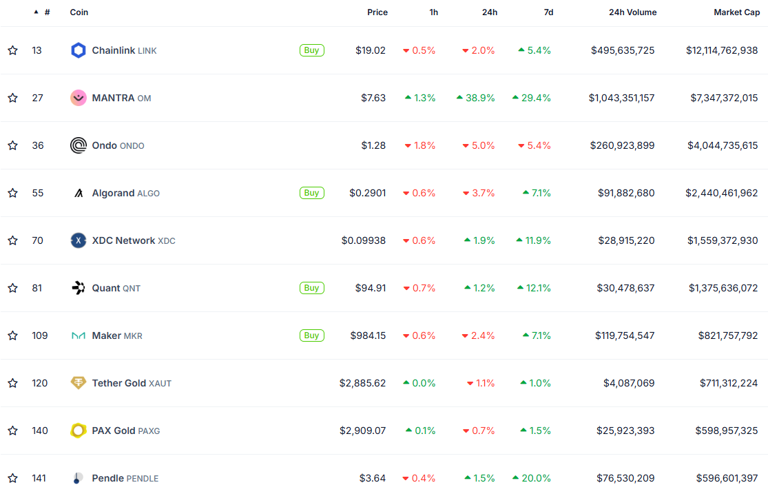 Більшість найбільших токенів реальних активів продовжують свій сильний висхідний тренд, лише ONDO показує зниження за останні сім днів.