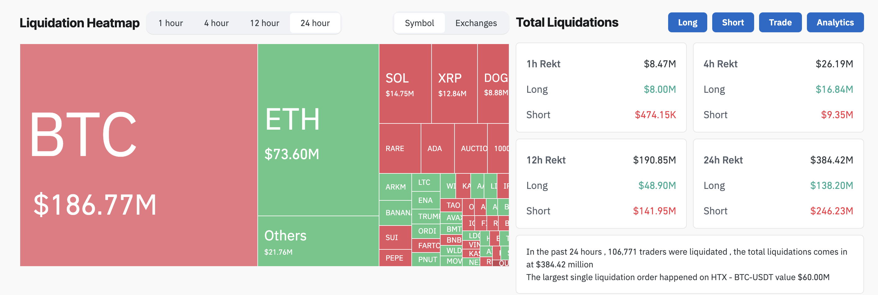 Згідно з даними Coinglass, 384,4 мільйона доларів було ліквідовано за останні 24 години. З цієї суми 138,2 мільйона доларів припало на довгі позиції, тоді як 246,2 мільйона доларів були короткими позиціями.
