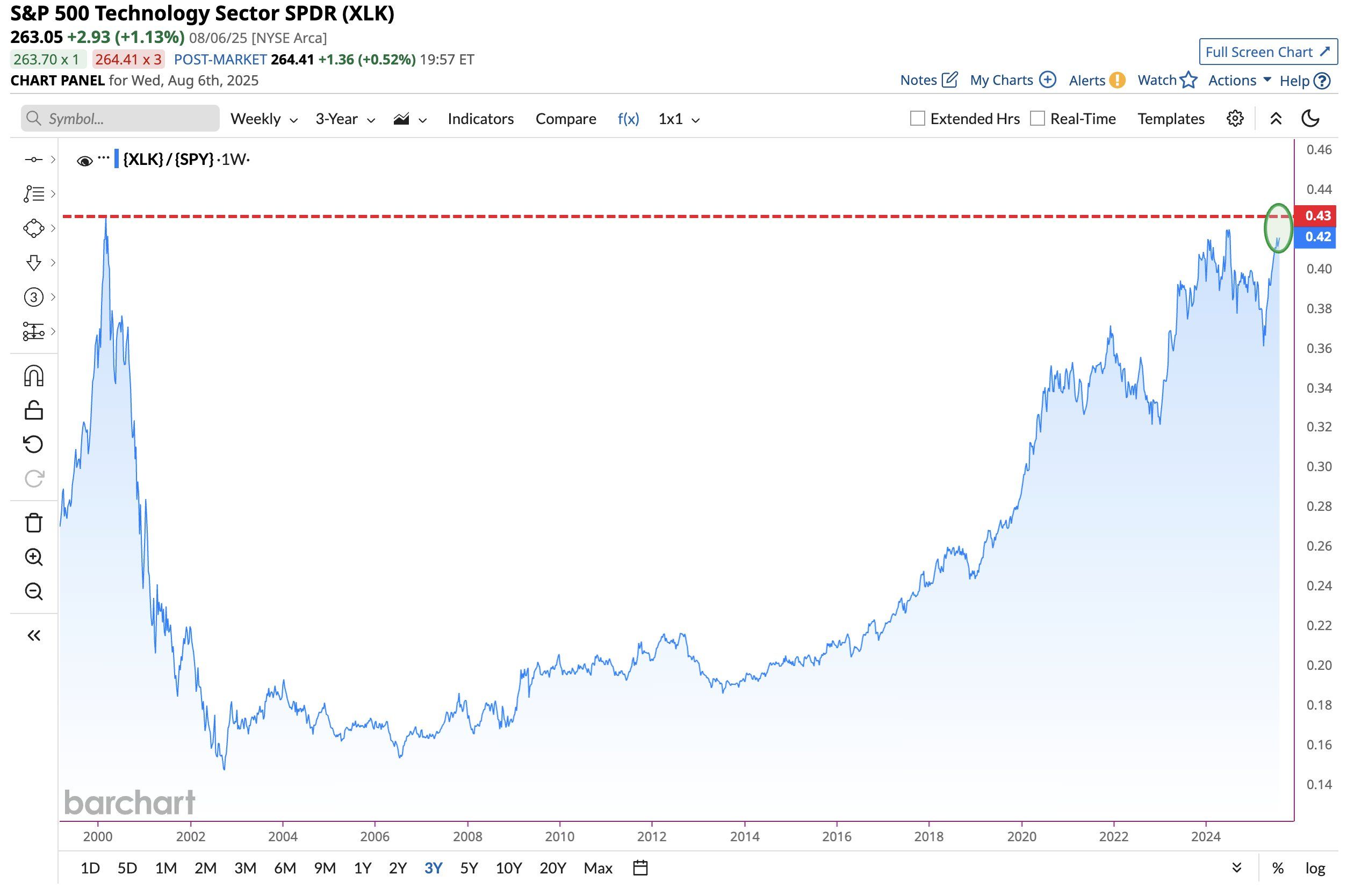 «Акції технологічних компаній перевершують S&P 500 з найбільшим відривом з часів піку дотком-бульбашки», — прокоментував постачальник ринкових даних Barchart на X.