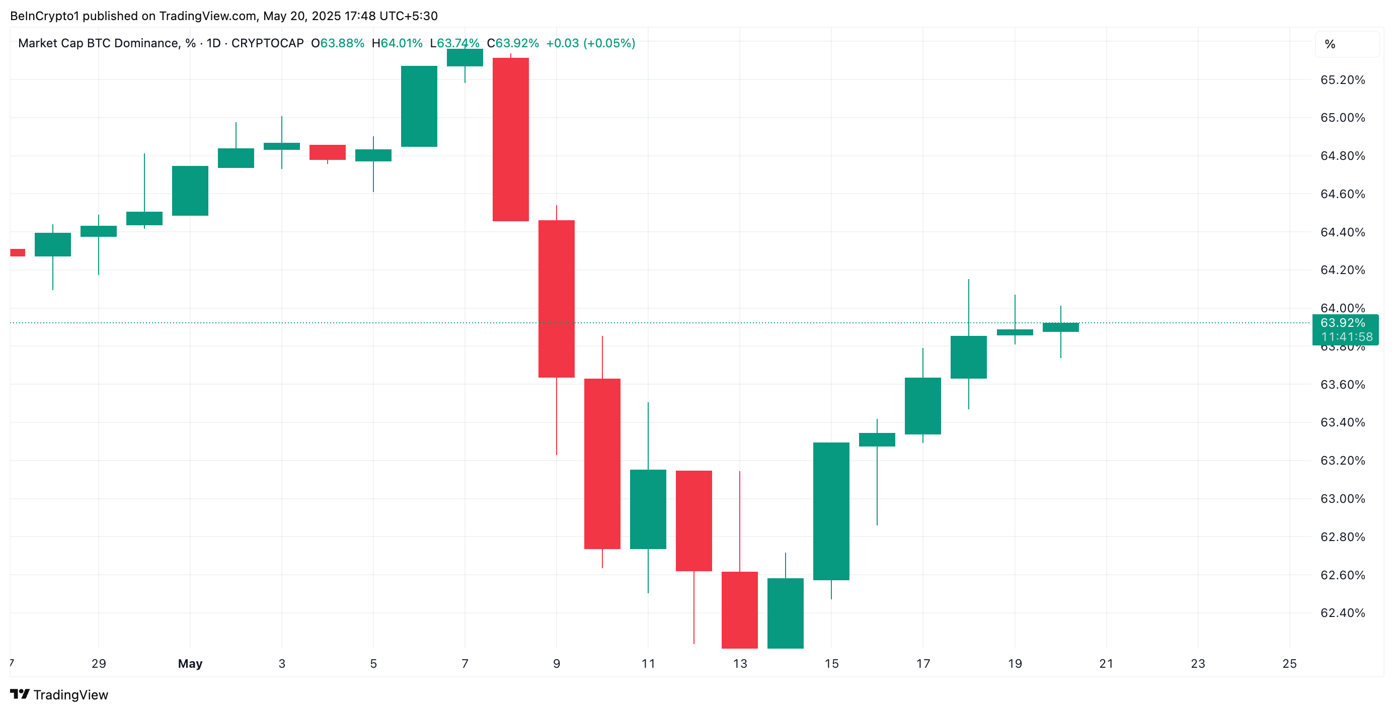 Крім того, зростаюче домінування біткоїна підтримує цю позицію. З моменту падіння до двомісячного мінімуму у 61,89 % 16 травня, BTC.D, показник, що відстежує частку біткоїна у загальній ринковій капіталізації криптовалют, стабільно зростає.