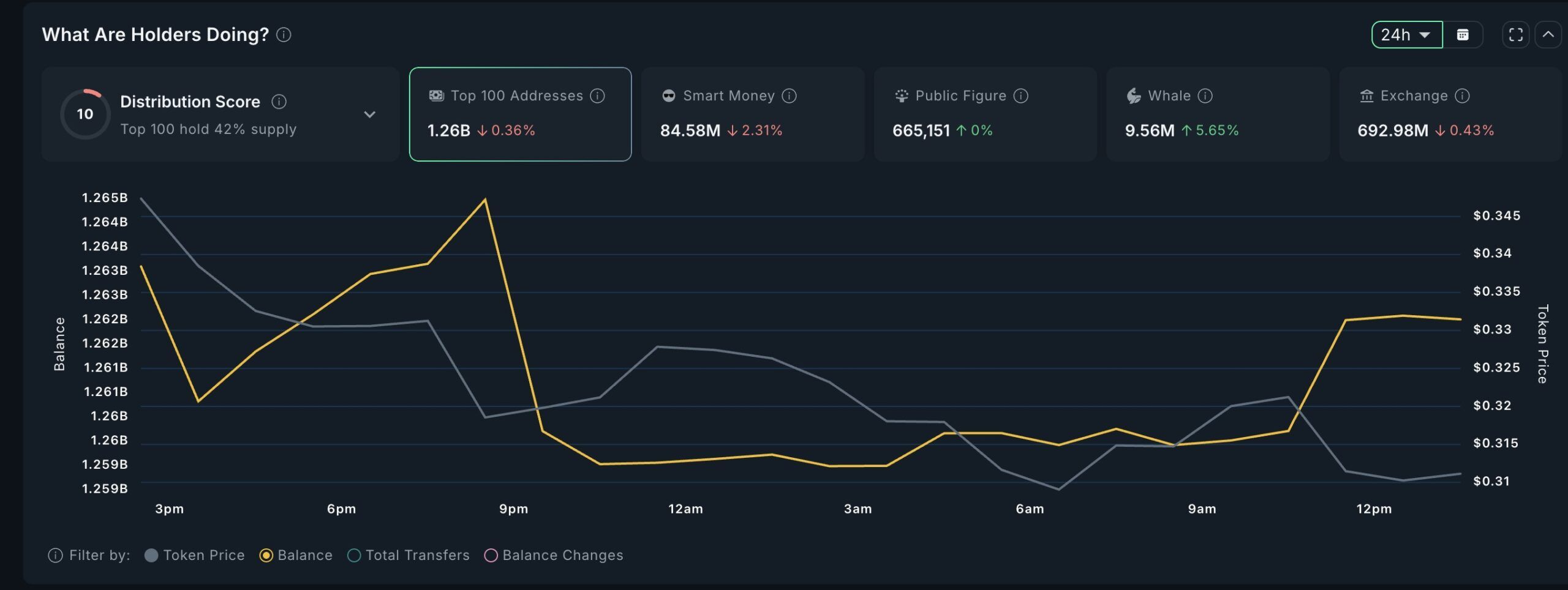 Графік балансу показує стабільне зростання з середини дня 14 липня, що вказує на новий попит, тоді як ціна токена коливалася між 0,32 і 0,33 доларів. Тим часом, баланси розумних грошей і бірж майже не змінилися, що свідчить про те, що дія була в основному накопиченням великих гаманців.