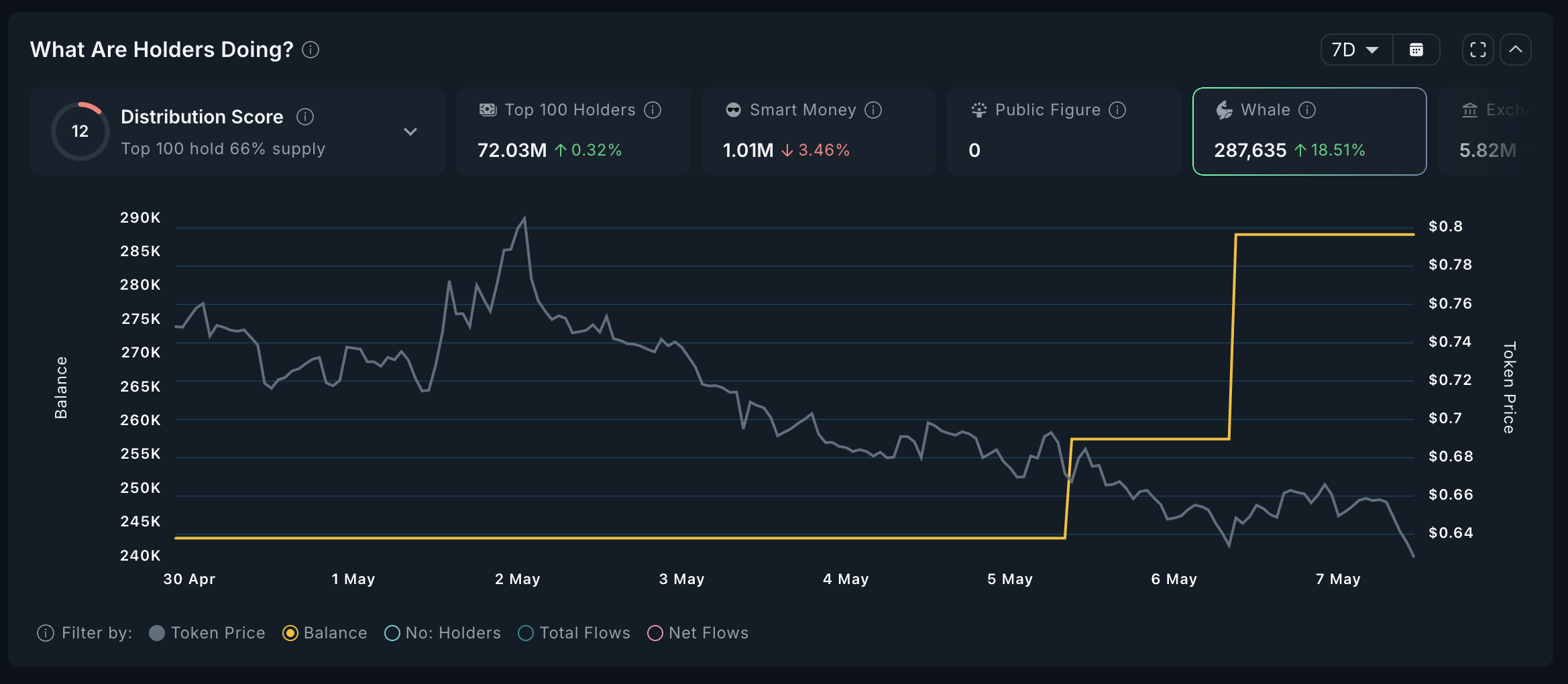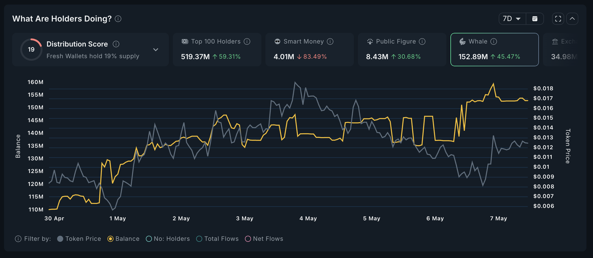 Ончейн-дані показують, що криптокити також значно накопичують NEET. Лише за останні сім днів кількість NEET, що утримується китами, зросла на 45 %, збільшившись з 110 мільйонів до 153 мільйонів токенів.