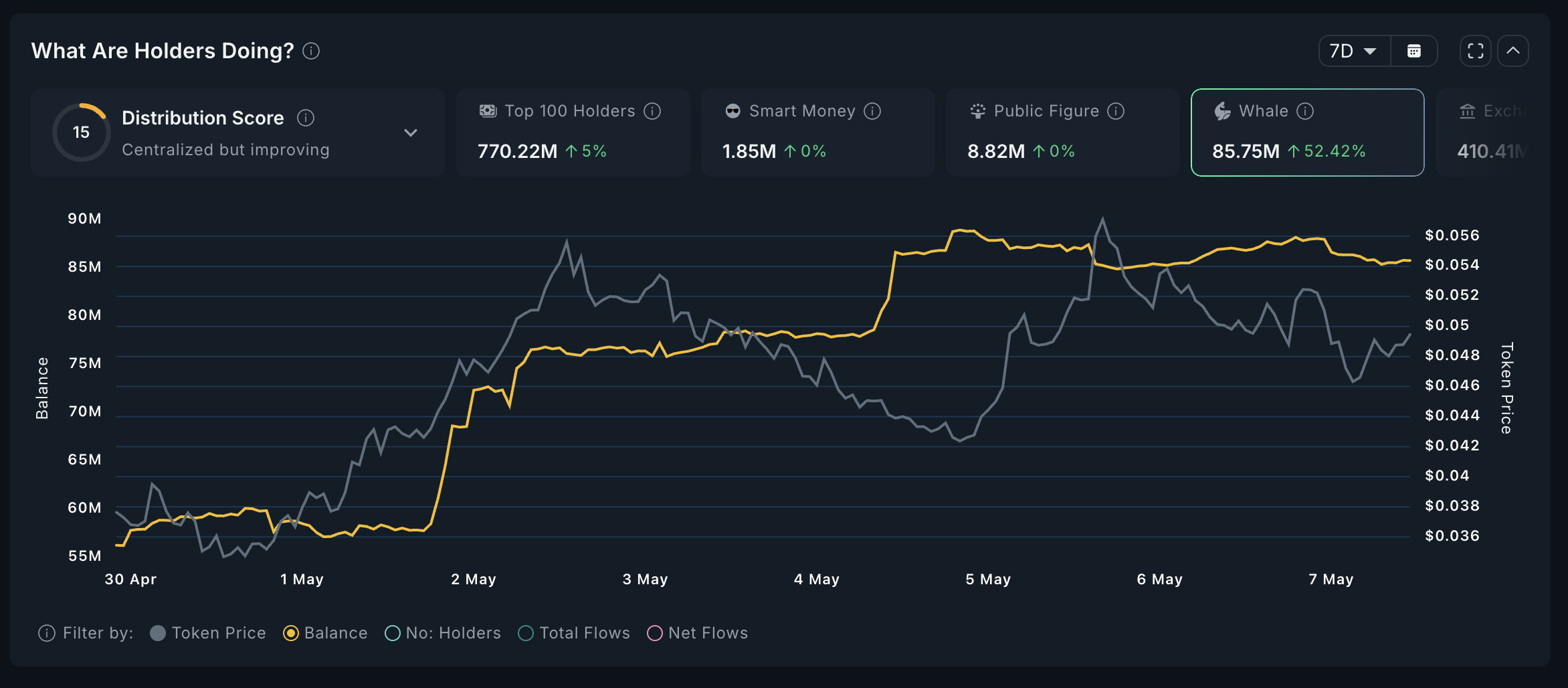 Поряд із зростанням ціни, накопичення китів посилилося — ончейн-дані показують, що володіння великими гаманцями зросло на 52 % за той самий період, збільшившись з 56,2 мільйона до 85,75 мільйона токенів.