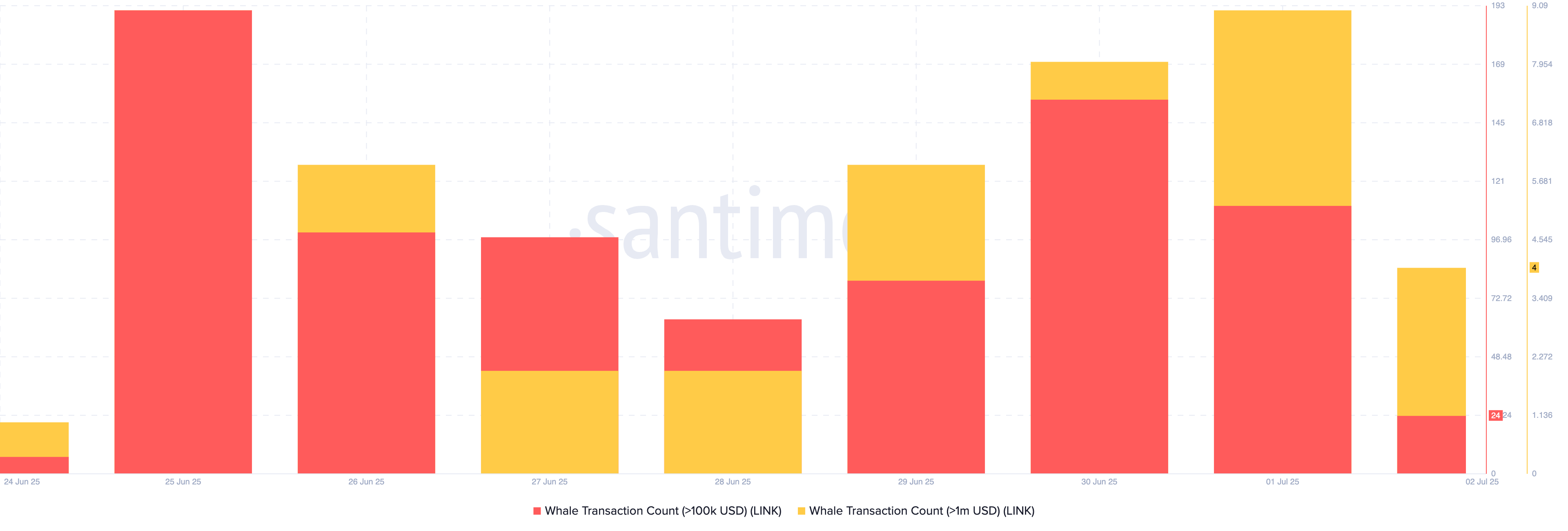 За даними Santiment, спостерігається стабільне зростання кількості транзакцій LINK, що перевищують 100 000 доларів і 1 мільйон доларів, що свідчить про те, що великі інвестори активно позиціонуються для можливих прибутків у липні.