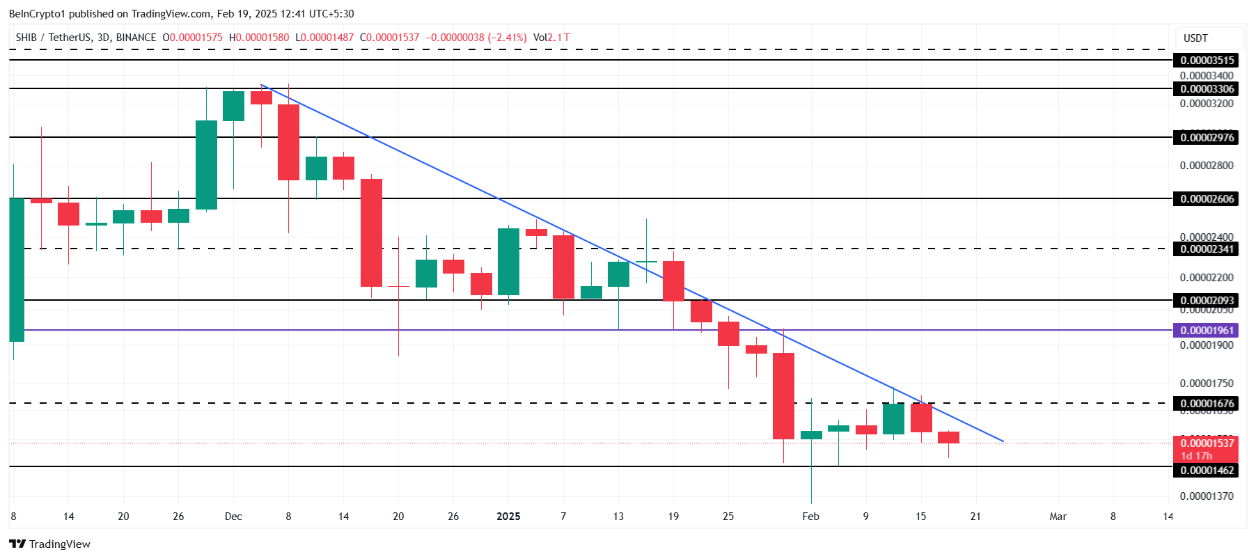 Ціна Shiba Inu становить 0,00001537 доларів, наразі застрягла нижче лінії спаду після невдалої спроби прорвати опір на рівні 0,00001676 доларів. Цей рівень опору виявився складним, і в результаті SHIB зазнає труднощів з набуттям висхідного імпульсу. Двомісячний спад свідчить про те, що подальші зниження можуть бути ймовірними, якщо не відбудеться значних змін у ринкових умовах.
