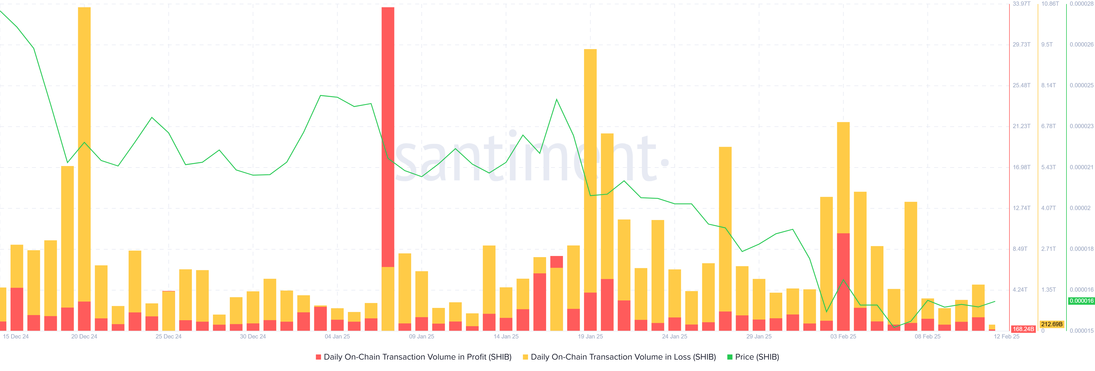 Протягом останніх півтора місяця обсяг збиткових угод значно перевищує кількість прибуткових, що свідчить про переважання ведмежих настроїв. Більшість власників SHIB перебувають у зоні втрат, що ще більше підриває довіру до активу та змушує багатьох утримуватися від активної участі в мережі.