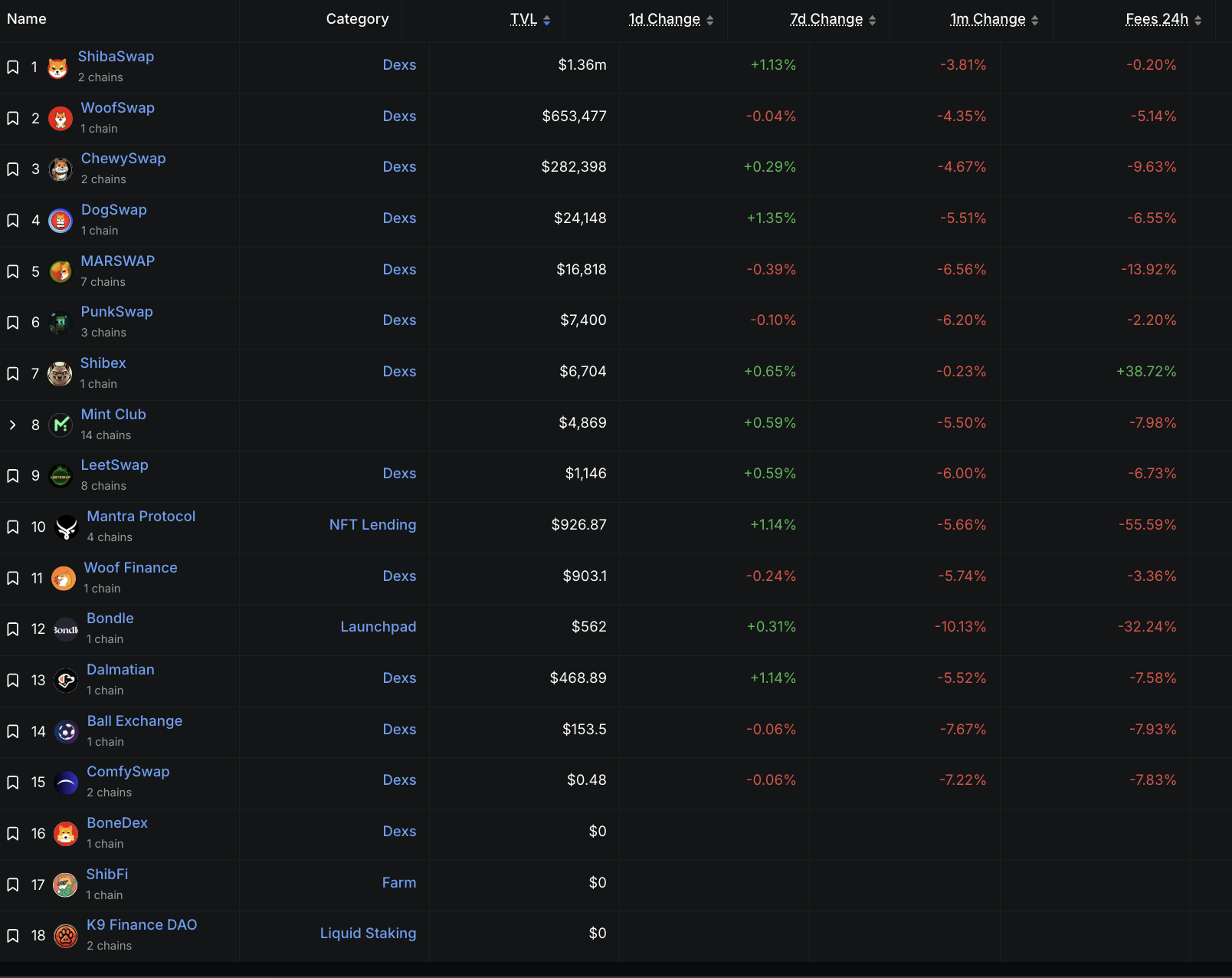 Дані з ланцюга від DefiLlama підтверджують цю розповідь. Наразі Shibarium підтримує лише 18 проєктів децентралізованих фінансів (DeFi) — різкий контраст з більш усталеними Layer-2, такими як Base та Arbitrum, які підтримують відповідно 549 та 741 проєкт.