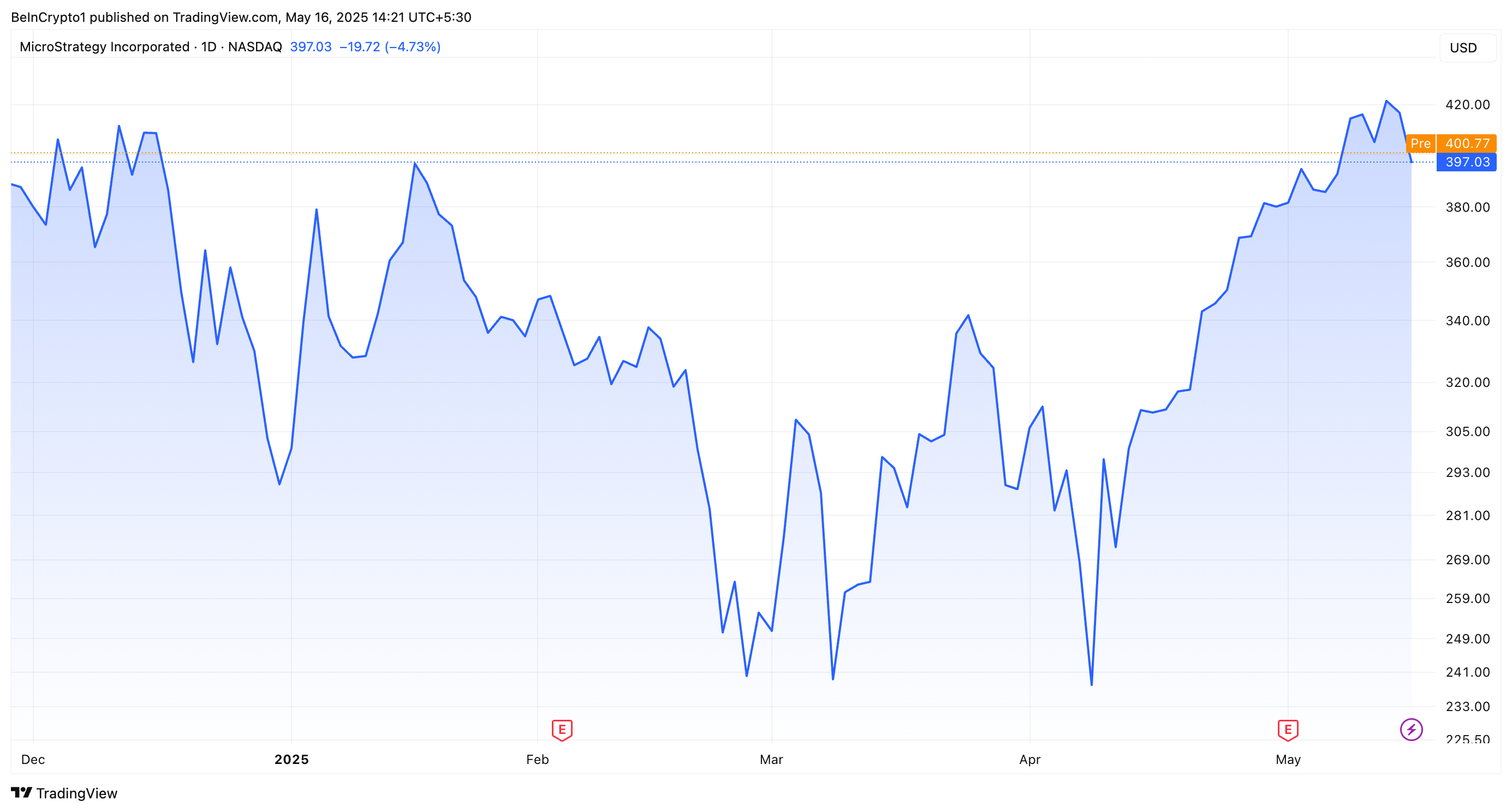 Фактично, з недавнім ралі біткоїна, ціни MSTR піднялися до 430 доларів 9 травня, що є найвищою ціною з 16 грудня 2024 року. Тим не менш, акції впали на 19,7 % за останній день, закрившись на рівні 397 доларів.