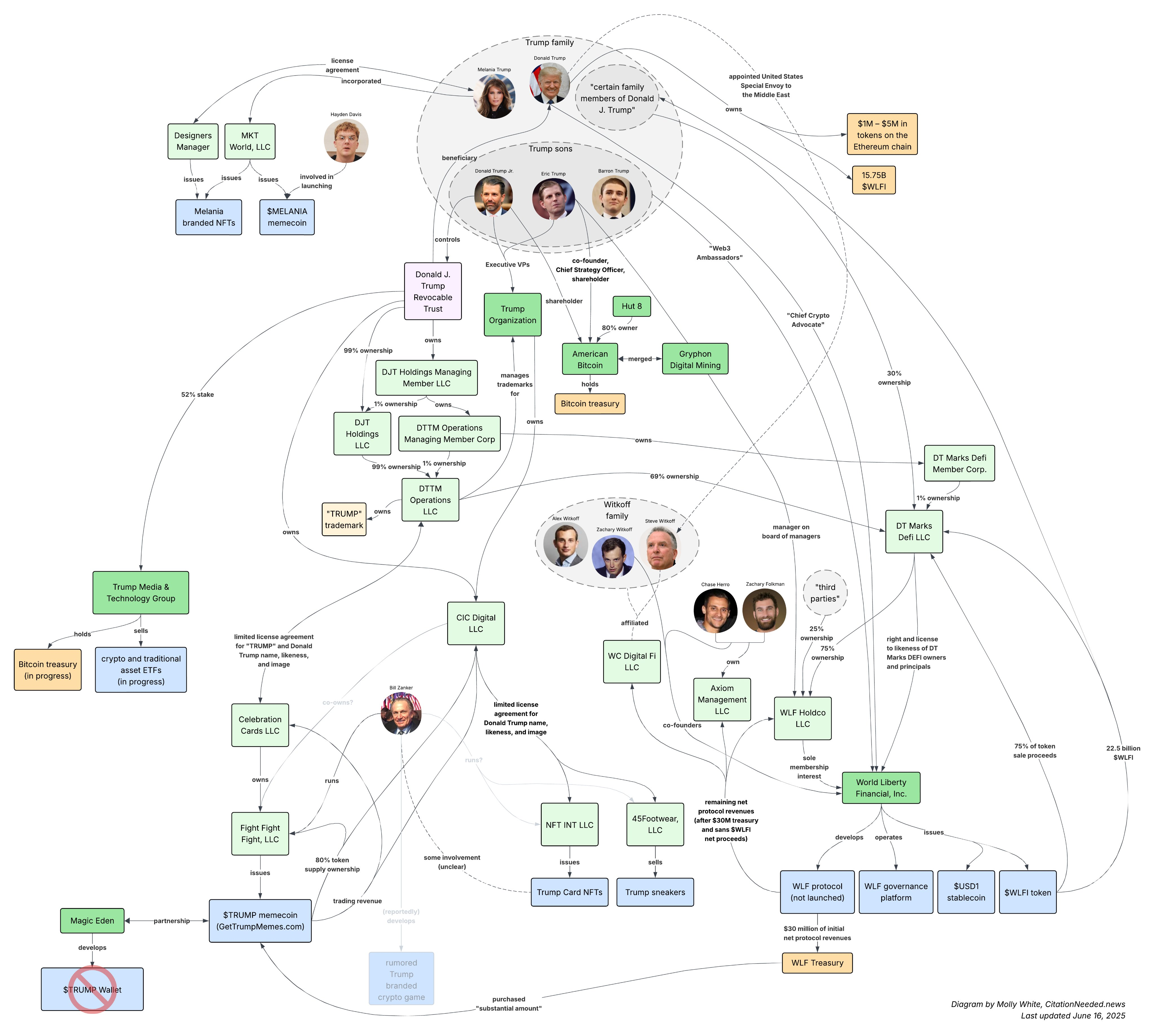 Криптоімперія Президента Трампа є дуже складною. Кілька членів його родини мають контрольні пакети акцій у різних фірмах та підприємствах, нещодавно створюючи плутанину щодо того, хто володіє ліцензією на продаж гаманця з брендом TRUMP.