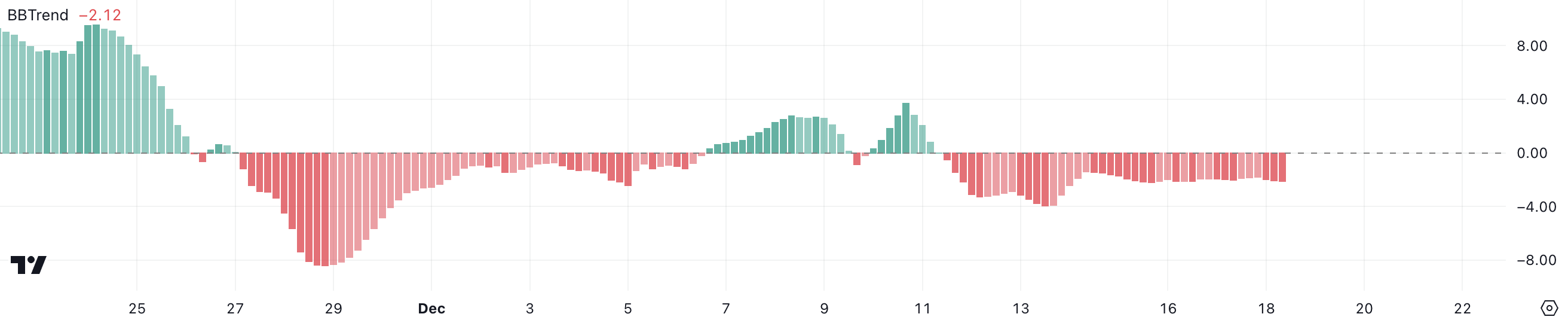 BBTrend є індикатором імпульсу, що походить від смуг Боллінджера, який вимірює силу та напрямок цінового тренду. Негативний BBTrend вказує на ведмежий імпульс, а тривалий період близько -2 відображає ринок, що намагається відновити зростання.